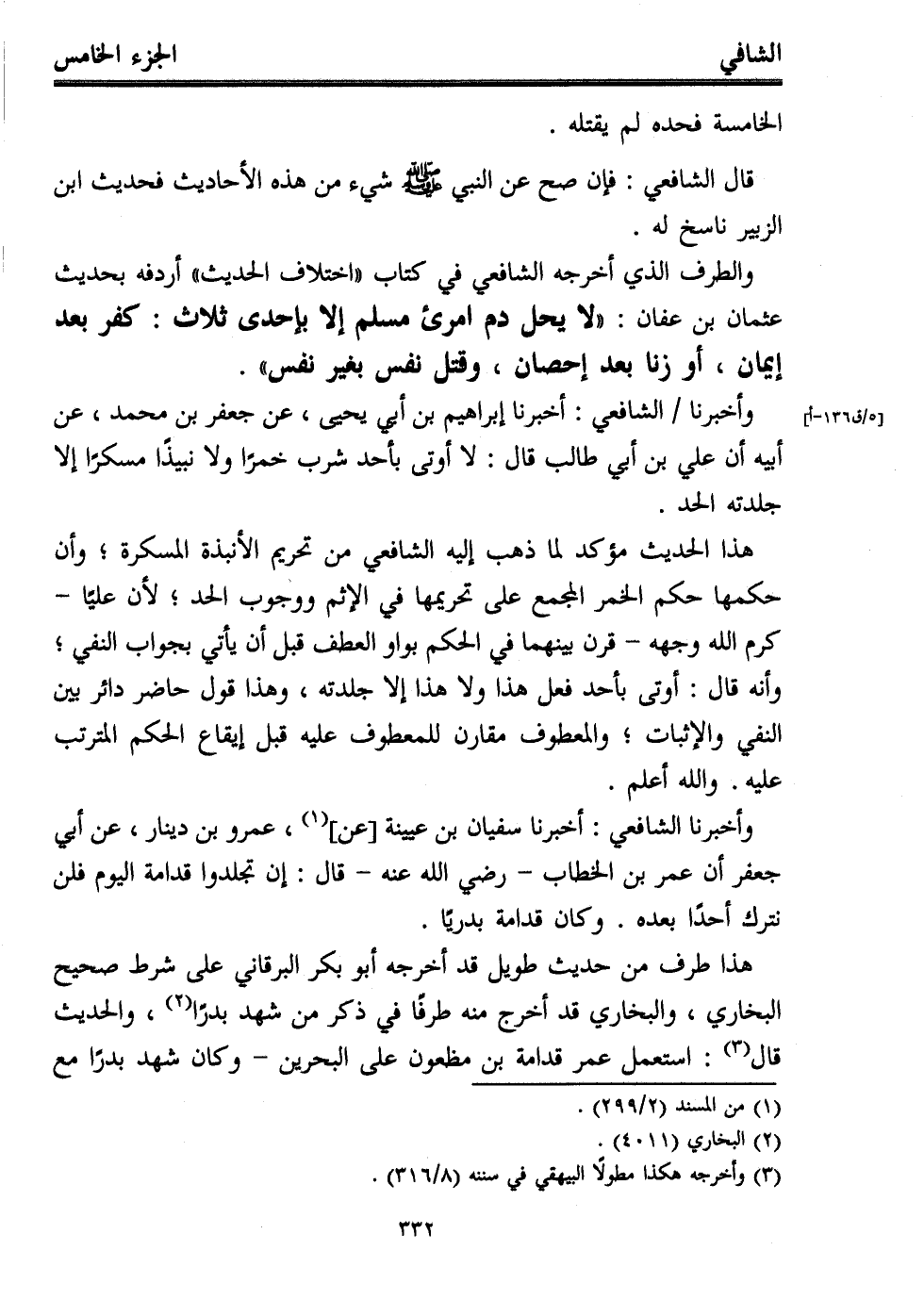 والطرف الذي أخرجه الشافعي في كتاب "اختلاف الحديث" أردفه بحديث عثمان بن عفان: "لا يحل دم امرئ مسلم إلا بإحدى ثلاث: كفر بعد إيمان، أو زنا بعد إحصان، وقتل نفس بغير نفس".