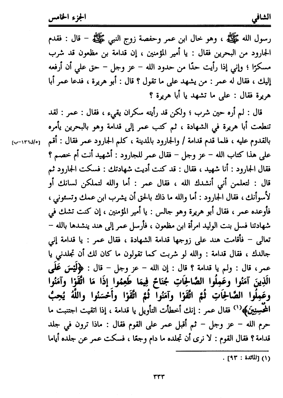 قال: لم أره حين شرب؛ ولكن قد رأيته سكران يقيء، فقال: عمر: لقد تنطعت أبا هررة في الشهادة، ثم كتب عمر إلى قدامة وهو بالبحرين يأمره بالقدوم عليه، فلما قدم قدامة والجارود بالمدينة، كلم الجارود عمر فقال: أقم على هذا كتاب الله -عز وجل- فقال عمر للجارود: أشهيد أنت أم خصم؟ فقال الجارود: أنا شهيد، فقال: قد كنت أديت شهادتك: فسكت الجارود ثم قال: لتعلمن أني أنشدك الله، فقال عمر: أما والله لتملكن لسانك أو لأسوأنك، فقال الجارود: أما والله ما ذاك بالحق أن يشرب ابن عمك وتسئوني، فأوعده عمر، فقال أبو هريرة وهو جالس: يا أمير المؤمنين، إن كنت تشك في شهادتنا فسل بنت الوليد امرأة ابن مظعون، فأرسل عمر إلى هند ينشدها بالله -تعالى- فأقامت هند على زوجها قدامة الشهادة، فقال عمر: يا قدامة إني جالدك، فقال قدامة: والله لو شربت كما تقولون ما كان لك أن تجلدني يا عمر، قال: ولم يا قدامة؟ قال: إن الله -عز وجل- قال: {لَيْسَ عَلَى الَّذِينَ آمَنُوا وَعَمِلُوا الصَّالِحَاتِ جُنَاحٌ فِيمَا طَعِمُوا إِذَا مَا اتَّقَوْا وَآمَنُوا وَعَمِلُوا الصَّالِحَاتِ ثُمَّ اتَّقَوْا وَآمَنُوا ثُمَّ اتَّقَوْا وَأَحْسَنُوا وَاللهُ يُحِبُّ الْمُحْسِنِينَ} (¬1) فقال عمر: إنك أخطأت التأويل يا قدامة، إذا اتقيت اجتنبت ما حرم الله -عز وجل- ثم أقبل عمر على القوم فقال: ماذا ترون في جلد قدامة؟ فقال القوم: لا نرى أن تجلده ما دام وجعًا، فسكت عمر عن جلده أياما