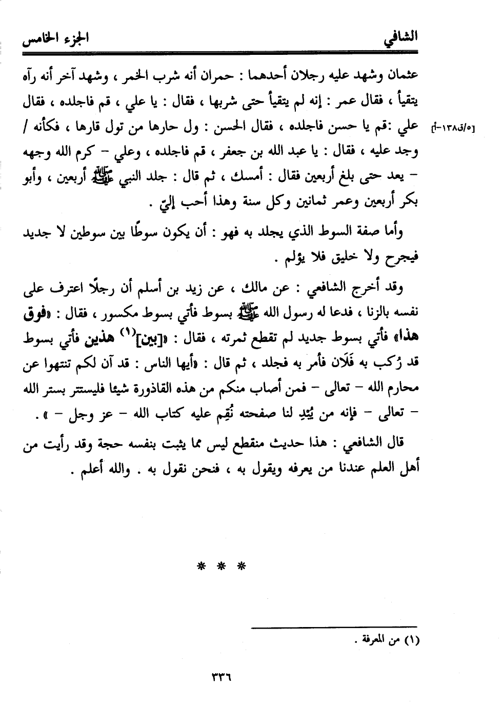 عثمان وشهد عليه رجلان أحدهما: حمران أنه شرب الخمر، وشهد آخر أنه رآه يتقيأ، فقال عمر: إنه لم يتقيأ حتى شربها، فقال: يا علي، قم فاجلده، فقال علي: قم يا حسن فاجلده، فقال الحسن: ول حارها من تول قارها، فكأنه وجد عليه، فقال: يا عبد الله بن جعفر، قم فاجلده، وعلي -كرم الله وجهه- يعد حتى بلغ أربعين فقال: أمسك، ثم قال: جلد النبي - صلى الله عليه وسلم - أربعين، وأبو بكر أربعين وعمر ثمانين وكل سنة وهذا أحب إليّ.