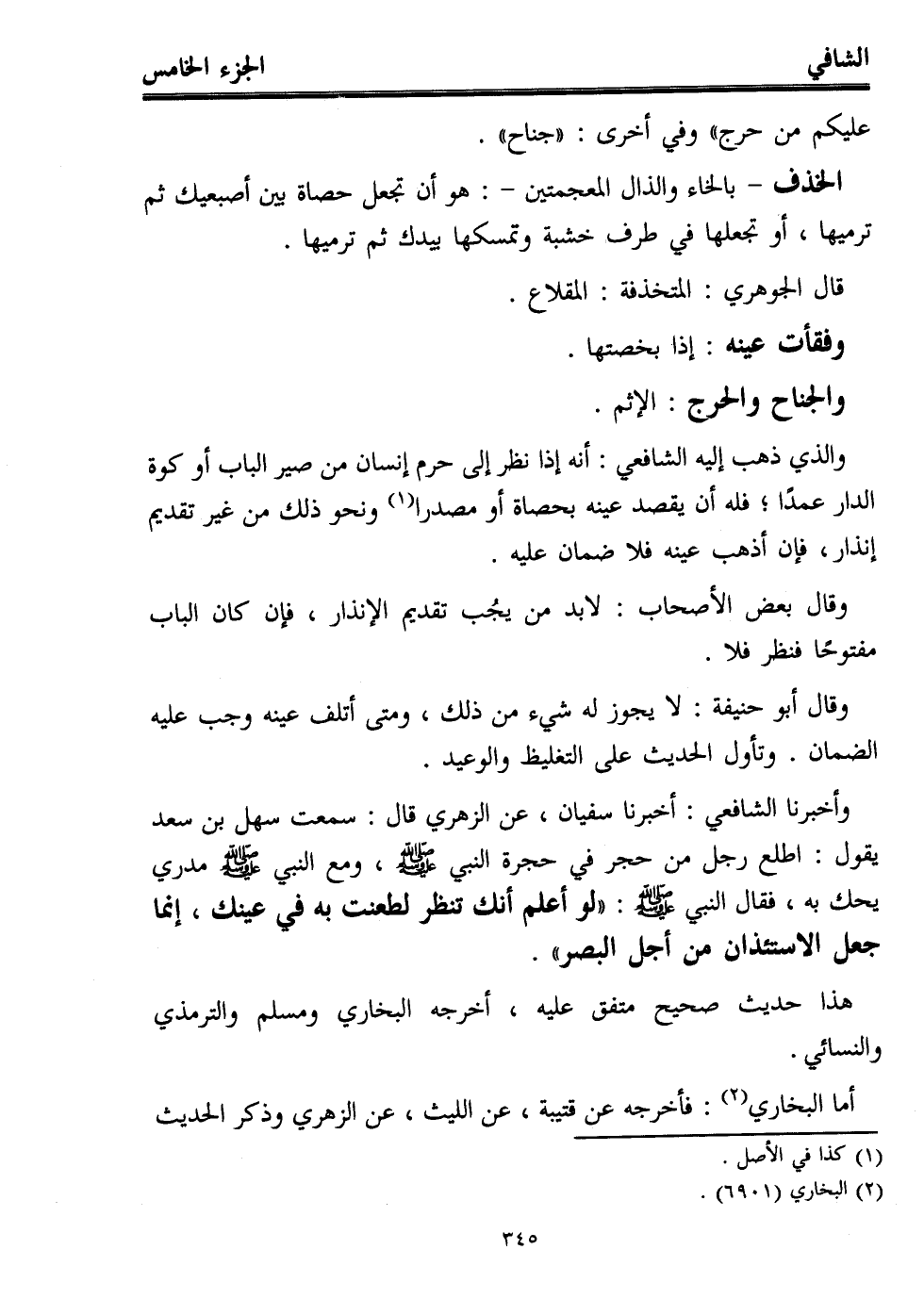 وأخبرنا الشافعي: أخبرنا سفيان، عن الزهري قال: سمعت سهل بن سعد يقول: اطلع رجل من حجر في حجرة النبي - صلى الله عليه وسلم -، ومع النبي - صلى الله عليه وسلم - مدري يحك به، فقال النبي - صلى الله عليه وسلم -: "لو أعلم أنك تنظر لطعنت به في عينك، إنما جعل الاستئذان من أجل البصر".