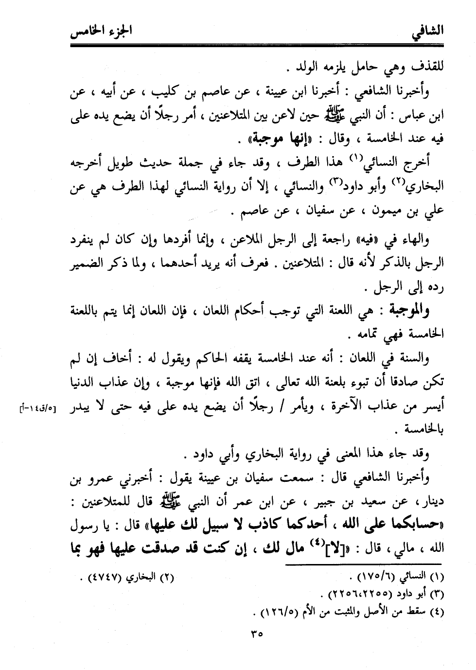 وأخبرنا الشافعي: أخبرنا ابن عيينة، عن عاصم بن كليب، عن أبيه، عن ابن عباس: أن النبي - صلى الله عليه وسلم - حين لاعن بين المتلاعنين، أمر رجلاً أن يضع يده على فيه عند الخامسة، وقال: "إنها موجبة".