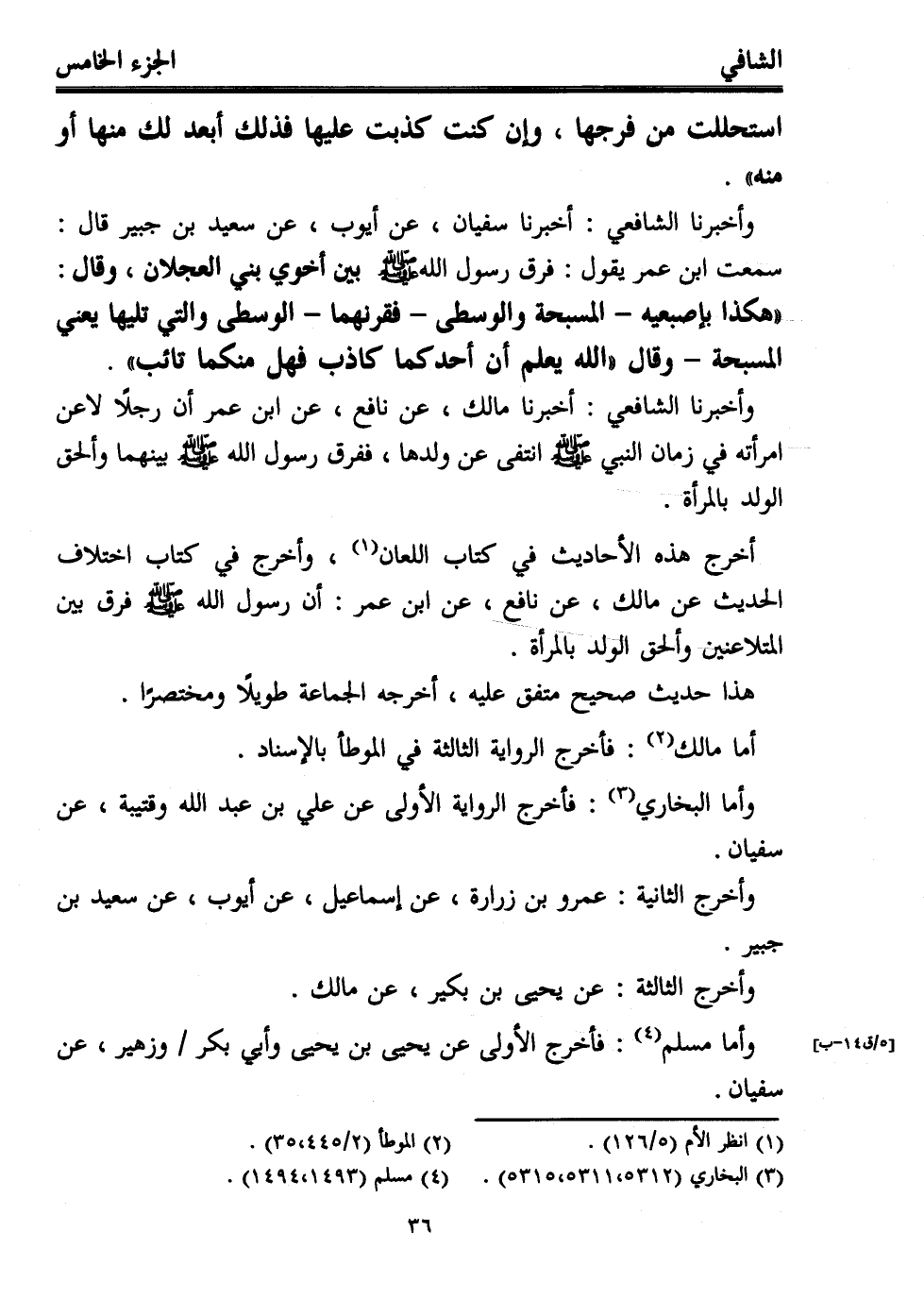 وأخبرنا الشافعي: أخبرنا سفيان، عن أيوب، عن سعيد بن جبير قال: سمعت ابن عمر يقول: فرق رسول الله - صلى الله عليه وسلم - بين أخوي بني العجلان، وقال: "هكذا بإصبعيه -المسبحة والوسطى- فقرنهما -الوسطى والتي تليها يعني المسبحة- وقال "الله يعلم أن أحدكما كاذب فهل منكما تائب".
