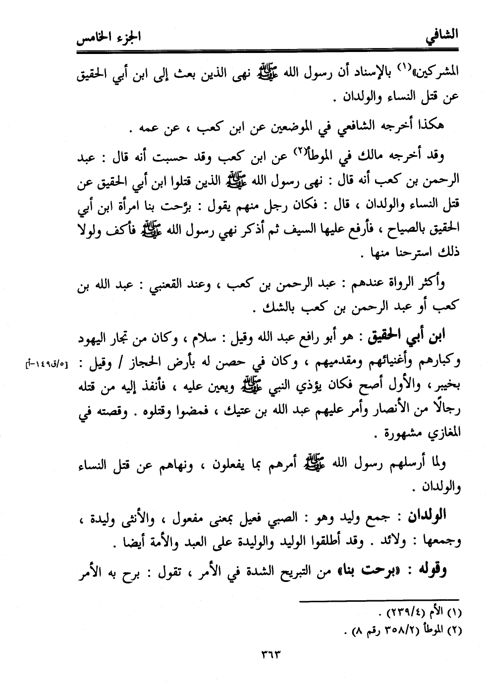 وقد أخرجه مالك في الموطأ (¬2) عن ابن كعب وقد حسبت أنه قال: عبد الرحمن بن كعب أنه قال: نهى رسول الله - صلى الله عليه وسلم - الذين قتلوا ابن أبي الحقيق عن قتل النساء والولدان، قال: فكان رجل منهم يقول: برَّحت بنا امرأة ابن أبي الحقيق بالصياح، فأرفع عليها السيف ثم أذكر نهي رسول الله - صلى الله عليه وسلم - فأكف ولولا ذلك استرحنا منها.