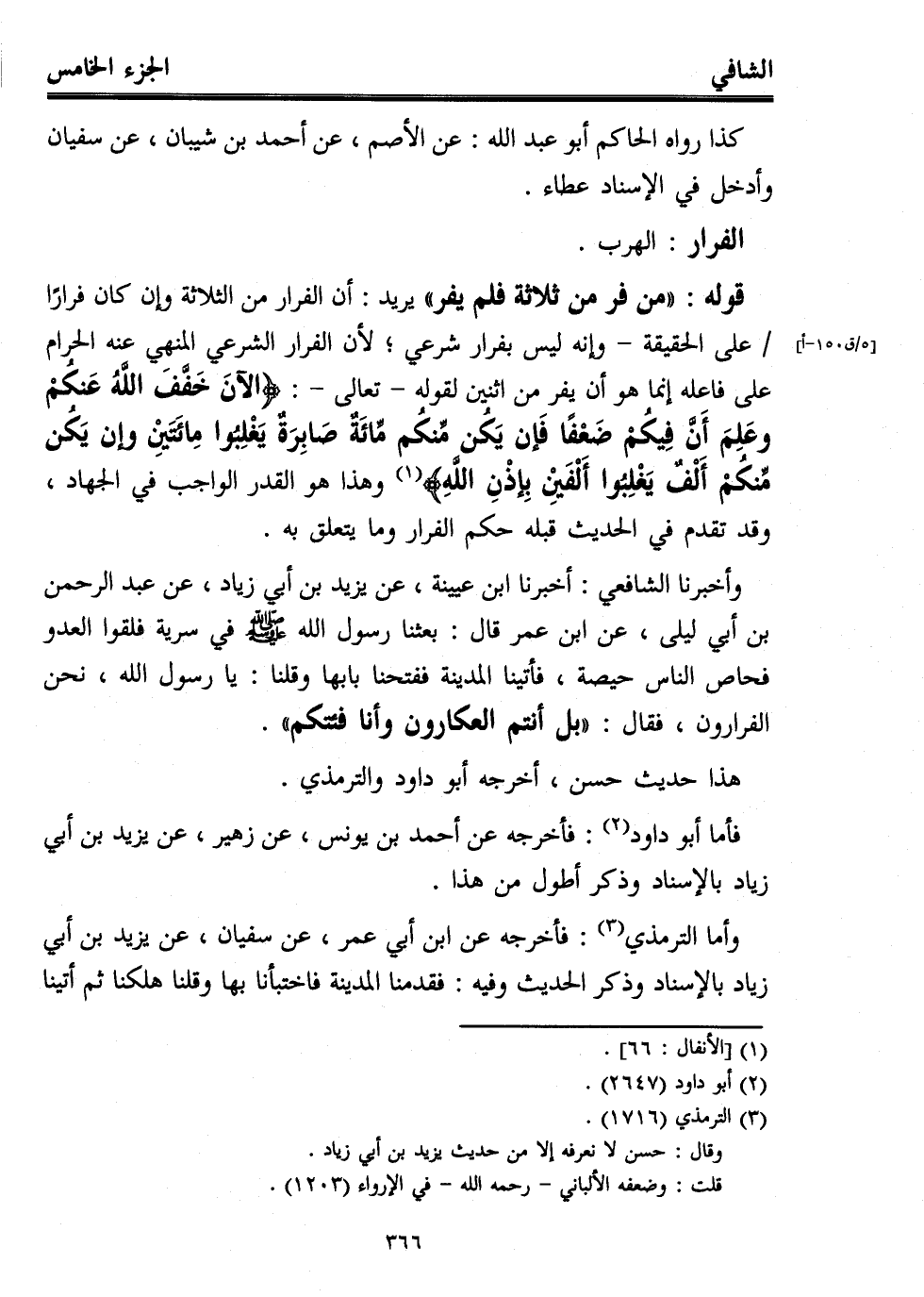 قوله: "من فر من ثلاثة فلم يفر" يريد: أن الفرار من الثلاثة وإن كان فرارًا على الحقيقة -وإنه ليس بفرار شرعي؛ لأن الفرار الشرعي المنهي عنه الحرام على فاعله إنما هو أن يفر من اثنين لقوله -تعالى-: {الْآنَ خَفَّفَ الله عَنْكُمْ وَعَلِمَ أَنَّ فِيكُمْ ضَعْفًا فَإِنْ يَكُنْ مِنْكُمْ مِائَةٌ صَابِرَةٌ يَغْلِبُوا مِائَتَيْنِ وَإِنْ يَكُنْ مِنْكُمْ أَلْفٌ يَغْلِبُوا أَلْفَيْنِ بِإِذْنِ اللهِ} (¬1) وهذا هو القدر الواجب في الجهاد، وقد تقدم في الحديث قبله حكم الفرار وما يتعلق به.
