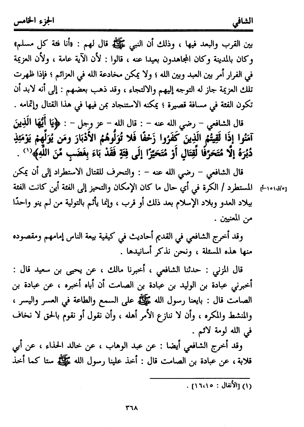 قال الشافعي -رضي الله عنه-: قال الله -عز وجل-: {يَا أَيُّهَا الَّذِينَ آمَنُوا إِذَا لَقِيتُمُ الَّذِينَ كَفَرُوا زَحْفًا فَلَا تُوَلُّوهُمُ الْأَدْبَارَ (15) وَمَنْ يُوَلِّهِمْ يَوْمَئِذٍ دُبُرَهُ إِلَّا مُتَحَرِّفًا لِقِتَالٍ أَوْ مُتَحَيِّزًا إِلَى فِئَةٍ فَقَدْ بَاءَ بِغَضَبٍ مِنَ اللهِ} (¬1).