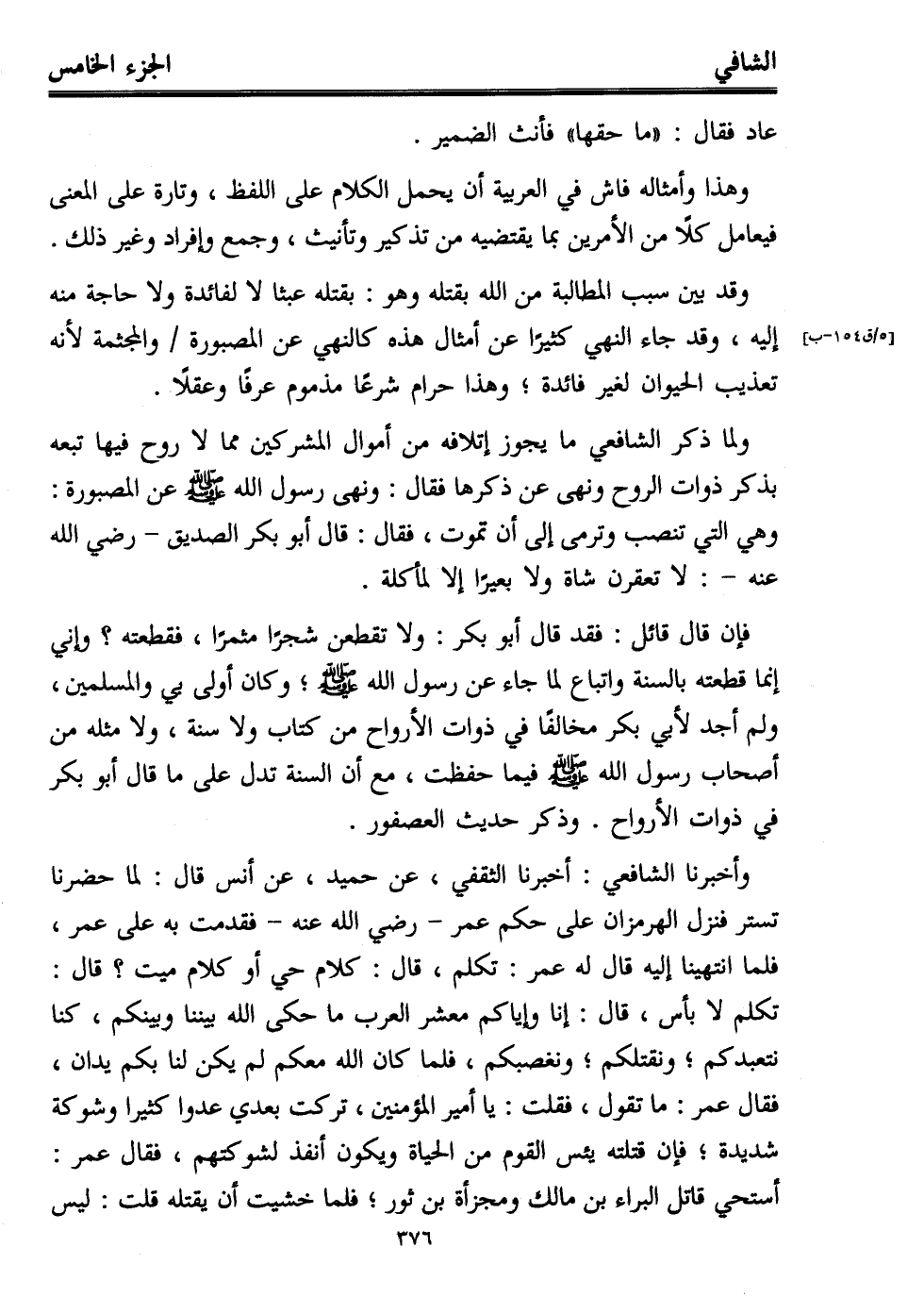 ولما ذكر الشافعي ما يجوز إتلافه من أموال المشركين مما لا روح فيها تبعه بذكر ذوات الروح ونهى عن ذكرها فقال: ونهى رسول الله - صلى الله عليه وسلم - عن المصبورة: وهي التي تنصب وترمى إلى أن تموت، فقال: قال أبو بكر الصديق -رضي الله عنه-: لا تعقرن شاة ولا بعيرًا إلا لمأكلة.