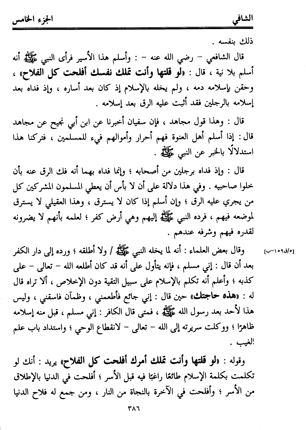 قال الشافعي -رضي الله عنه-: وأسلم هذا الأسير فرأى النبي - صلى الله عليه وسلم - أنه أسلم بلا نية، قال: "لو قلتها وأنت تملك نفسك أفلحت كل الفلاح"، وحقن بإسلامه دمه، ولم يخله بالإسلام إذ كان بعد أساره، وإذ فداه بعد إسلامه بالرجلين فقد أثبت عليه الرق بعد إسلامه.