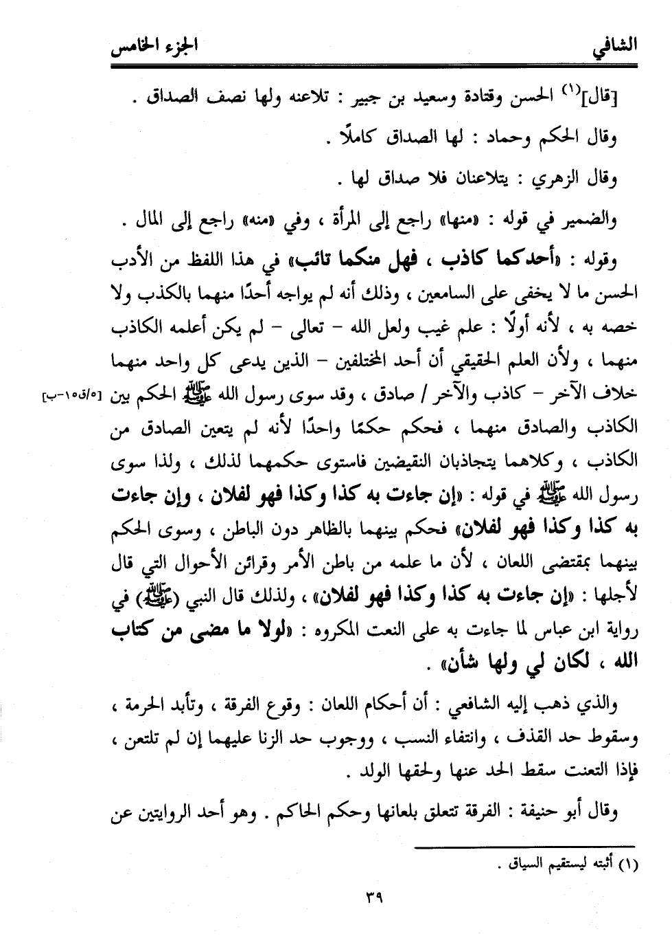 وقوله: "أحدكما كاذب، فهل منكما تائب" في هذا اللفظ من الأدب الحسن ما لا يخفى على السامعين، وذلك أنه لم يواجه أحدًا منهما بالكذب ولا خصه به, لأنه أولاً: علم غيب ولعل الله -تعالى- لم يكن أعلمه الكاذب منهما, ولأن العلم الحقيقي أن أحد المختلفين -الذين يدعى كل واحد منهما خلاف الآخر- كاذب والآخر صادق، وقد سوى رسول الله - صلى الله عليه وسلم - الحكم بين الكاذب والصادق منهما، فحكم حكمًا واحدًا لأنه لم يتعين الصادق من الكاذب، وكلاهما يتجاذبان النقيضين فاستوى حكمهما لذلك، ولذا سوى رسول الله - صلى الله عليه وسلم - في قوله: "إن جاءت به كذا وكذا فهو لفلان، وإن جاءت به كذا وكذا فهو لفلان" فحكم بينهما بالظاهر دون الباطن، وسوى الحكم بينهما بمقتضى اللعان, لأن ما علمه من باطن الأمر وقرائن الأحوال التي قال لأجلها: "إن جاءت به كذا وكذا فهو لفلان"، ولذلك قال النبي - صلى الله عليه وسلم - في رواية ابن عباس لما جاءت به على النعت المكروه: "لولا ما مضى من كتاب الله، لكان لي ولها شأن".
