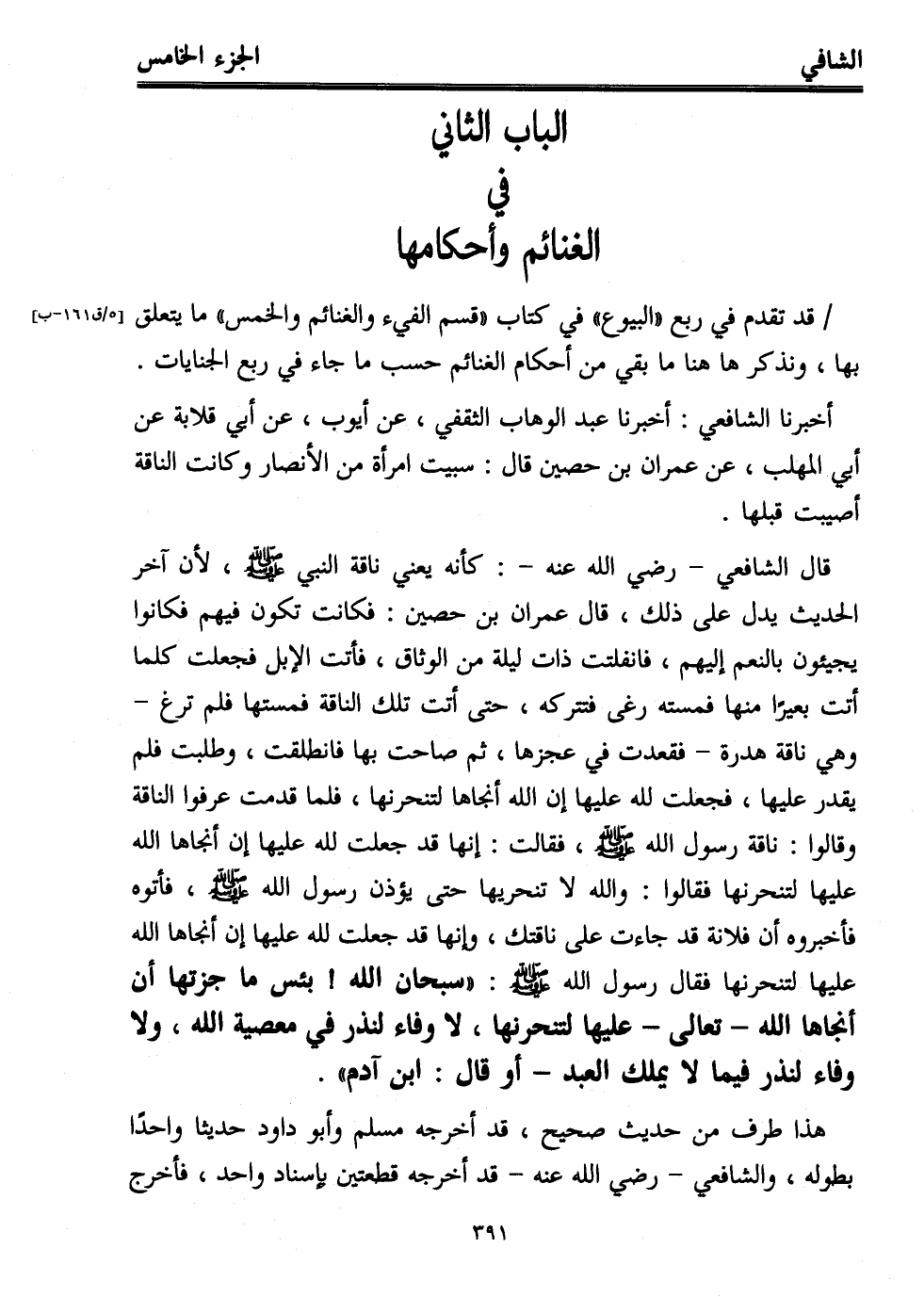 قال الشافعي -رضي الله عنه-: كأنه يعني ناقة النبي - صلى الله عليه وسلم -, لأن آخر الحديث يدل على ذلك، قال عمران بن حصين: فكانت تكون فيهم فكانوا يجيئون بالنعم إليهم، فانفلتت ذات ليلة من الوثاق، فأتت الإبل فجعلت كلما أتت بعيرًا منها فمسته رغى فتتركه، حتى أتت تلك الناقة فمستها فلم ترغ -وهي ناقة هدرة- فقعدت في عجزها، ثم صاحت بها فانطلقت، وطلبت فلم يقدر عليها، فجعلت لله عليها إن الله أنجاها لتنحرنها، فلما قدمت عرفوا الناقة وقالوا: ناقة رسول الله - صلى الله عليه وسلم -، فقالت: إنها قد جعلت لله عليها إن أنجاها الله عليها لتنحرنها فقالوا: والله لا تنحريها حتى يؤذن رسول الله - صلى الله عليه وسلم -، فأتوه فأخبروه أن فلانة قد جاءت على ناقتك، وإنها قد جعلت لله عليها إن أنجاها الله عليها لتنحرنها فقال رسول الله - صلى الله عليه وسلم -: "سبحان الله! بئس ما جزتها أن أنجاها الله -تعالى- عليه لتنحرنها, لا وفاء لنذر في معصية الله، ولا وفاء لنذر فيما لا يملك العبد -أو قال: ابن آدم".