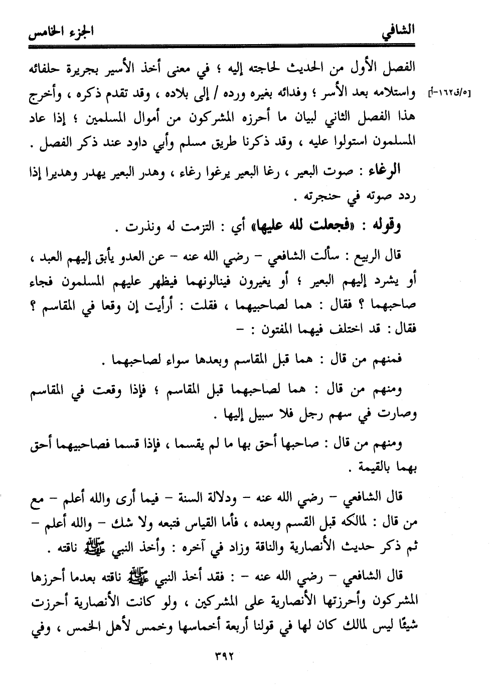 قال الشافعي -رضي الله عنه-: فقد أخذ النبي - صلى الله عليه وسلم - ناقته بعدما أحرزها المشركون وأحرزتها الأنصارية على المشركين، ولو كانت الأنصارية أحرزت شيئًا ليس لمالك كان لها في قولنا أربعة أخماسها وخمس لأهل الخمس، وفي