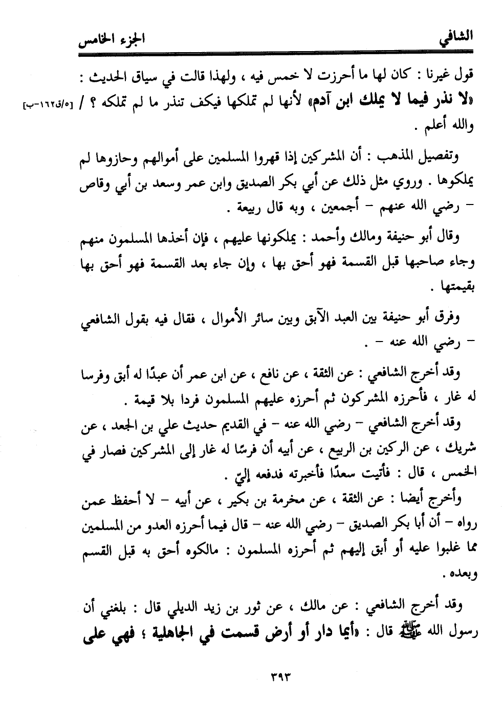 وقد أخرج الشافعي: عن الثقة، عن نافع، عن ابن عمر أن عبدًا له أبق وفرسا له غار، فأحرزه المشركون ثم أحرزه عليهم المسلمون فردا بلا قيمة.