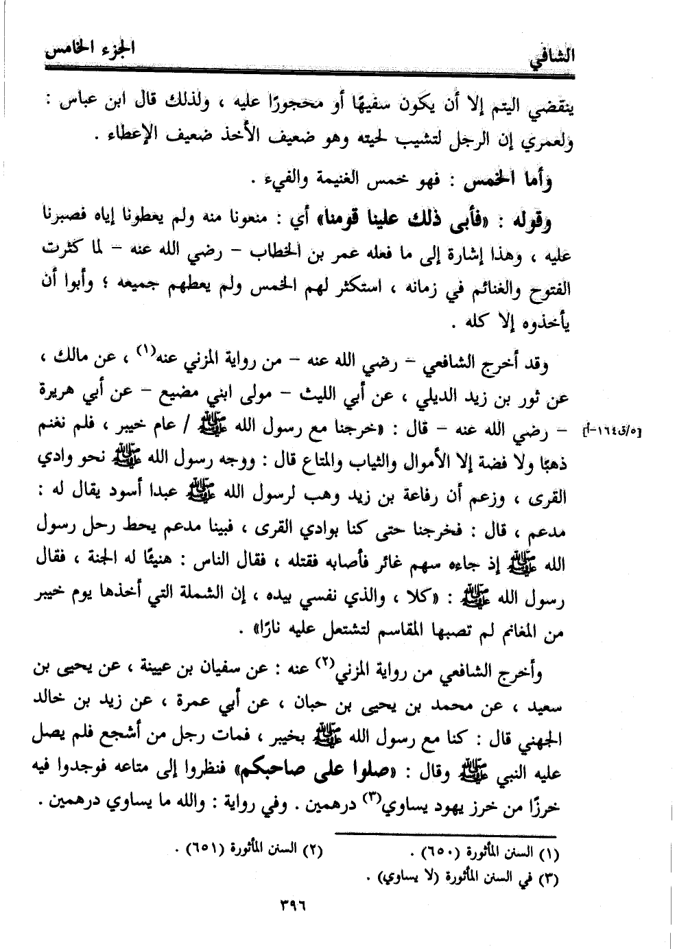 وأخرج الشافعي من رواية المزني (¬2) عنه: عن سفيان بن عيينة، عن يحيى بن سعيد، عن محمد بن يحيى بن حبان، عن أبي عمرة، عن زيد بن خالد الجهني قال: كنا مع رسول الله - صلى الله عليه وسلم - بخيبر، فمات رجل من أشجع فلم يصل عليه النبي - صلى الله عليه وسلم - وقال: "صلوا على صاحبكم" فنظروا إلى متاعه فوجدوا فيه خرزًا من خرز يهود يساوي (¬3) درهمين. وفي رواية: والله ما يساوي درهمين.