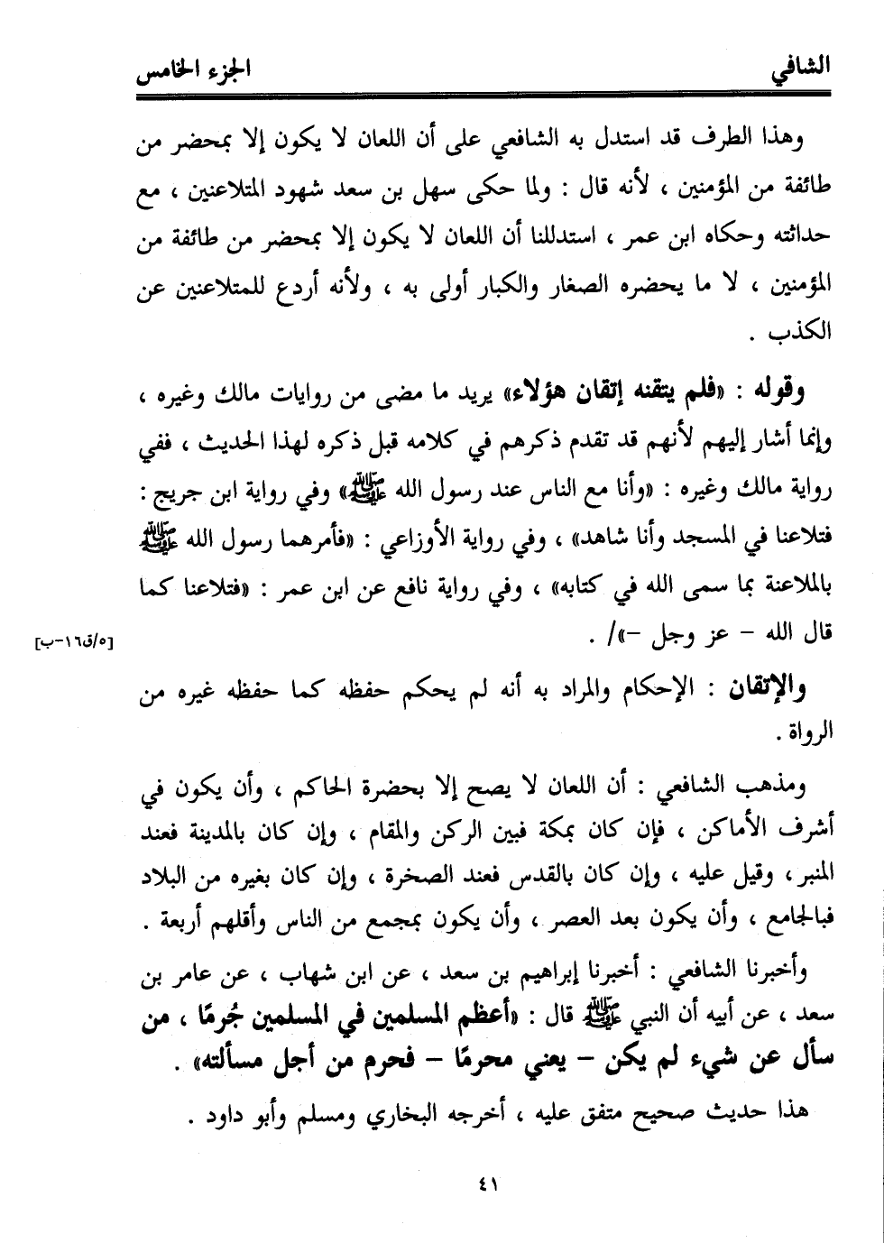 وهذا الطرف قد استدل به الشافعي على أن اللعان لا يكون إلا بمحضر من طائفة من المؤمنين، لأنه قال: ولما حكى سهل بن سعد شهود المتلاعنين، مع حداثته وحكاه ابن عمر، استدللنا أن اللعان لا يكون إلا بمحضر من طائفة من المؤمنين، لا ما يحضره الصغار والكبار أولى به، ولأنه أردع للمتلاعنين عن الكذب.