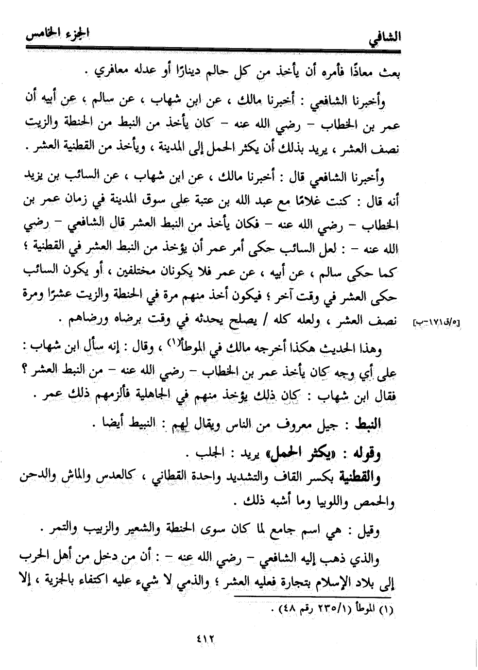 وأخبرنا الشافعي قال: أخبرنا مالك، عن ابن شهاب، عن السائب ابن يزيد أنه قال: كنت غلامًا مع عبد الله بن عتبة على سوق المدينة في زمان عمر بن الخطاب -رضي الله عنه- فكان يأخذ من النبط العشر قال الشافعي -رضي الله عنه-: لعل السائب حكى أمر عمر أن يؤخذ من النبط العشر في القطنية؛ كما حكى سالم، عن أبيه، عن عمر فلا يكونان مختلفين، أو يكون السائب حكى العشر في وقت آخر؛ فيكون أخذ منهم مرة في الحنطة والزيت عشرًا ومرة نصف العشر، ولعله كله يصلح يحدثه في وقت برضاه ورضاهم.