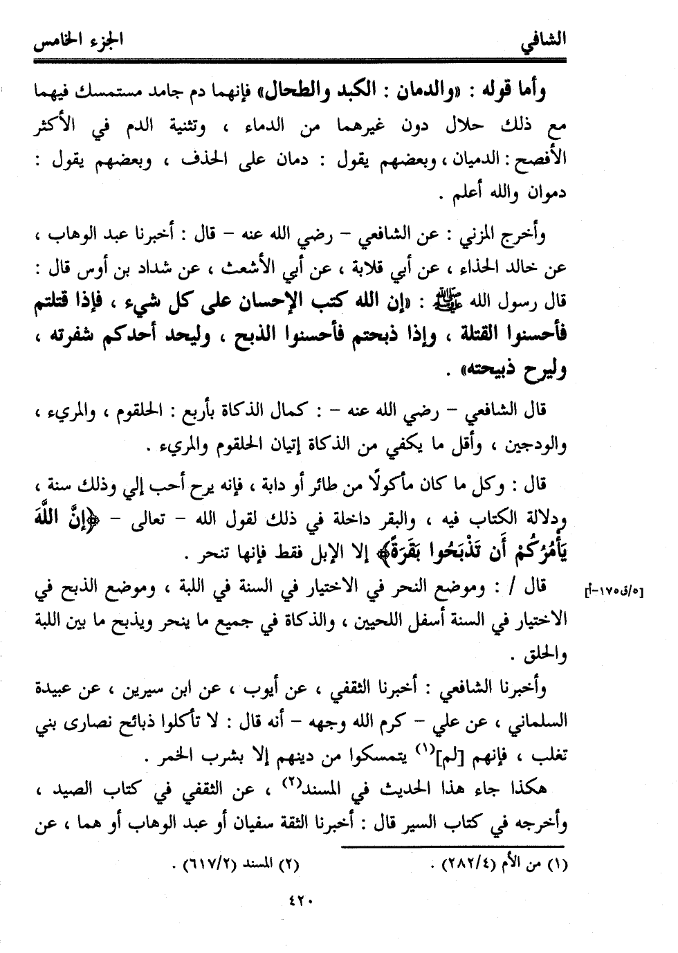 وأخرج المزني: عن الشافعي -رضي الله عنه- قال: أخبرنا عبد الوهاب، عن خالد الحذاء، عن أبي قلابة، عن أبي الأشعث، عن شداد بن أوس قال: قال رسول الله - صلى الله عليه وسلم -: "إن الله كتب الإحسان على كل شيء، فإذا قتلتم فأحسنوا القتلة، وإذا ذبحتم فأحسنوا الذبح، وليحد أحدكم شفرته، وليرح ذبيحته".