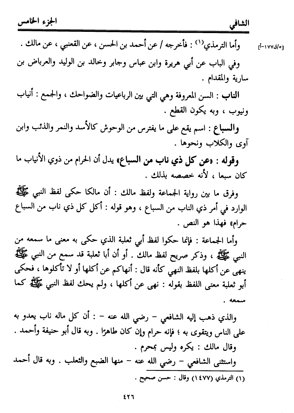 والذي ذهب إليه الشافعي -رضي الله عنه-: أن كل ماله ناب يعدو به على الناس ويتقوى به؛ فإنه حرام وإن كان طاهرًا. وبه قال أبو حنيفة وأحمد.