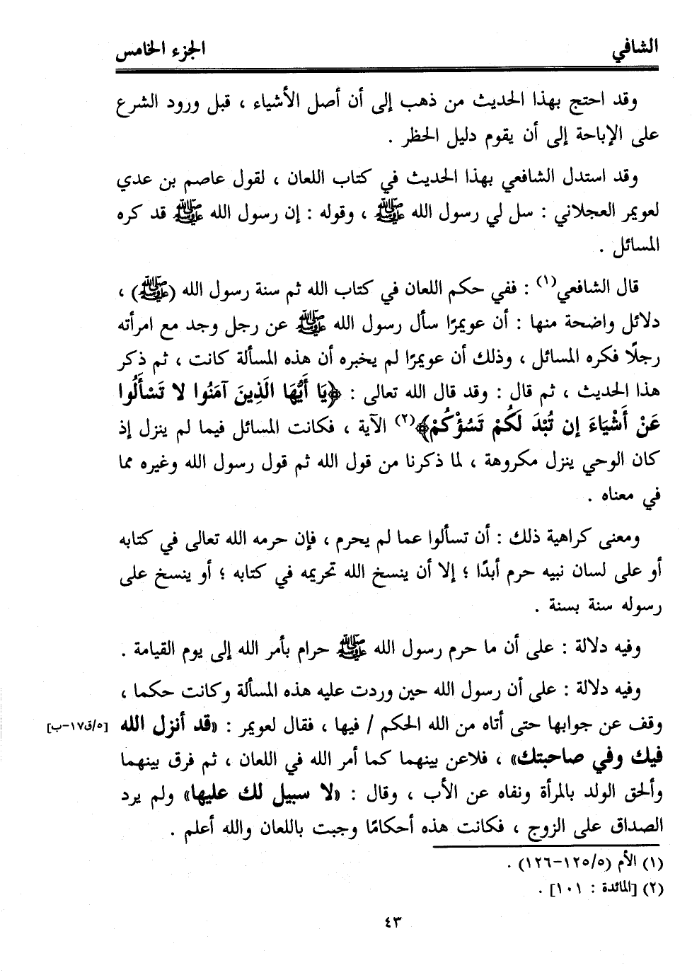قال الشافعي (¬1): ففي حكم اللعان في كتاب الله ثم سنة رسول الله (- صلى الله عليه وسلم -)، دلائل واضحة منها: أن عويمرًا سأل رسول الله - صلى الله عليه وسلم - عن رجل وجد مع امرأته رجلاً فكره المسائل، وذلك أن عويمرًا لم يخبره أن هذه المسألة كانت، ثم ذكر هذا الحديث، ثم قال: وقد قال الله تعالى: {يَا أَيُّهَا الَّذِينَ آمَنُوا لَا تَسْأَلُوا عَنْ أَشْيَاءَ إِنْ تُبْدَ لَكُمْ تَسُؤْكُمْ} (¬2) الآية، فكانت المسائل فيما لم ينزل إذ كان الوحي ينزل مكروهة، لما ذكرنا من قول الله ثم قول رسول الله وغيره مما في معناه.