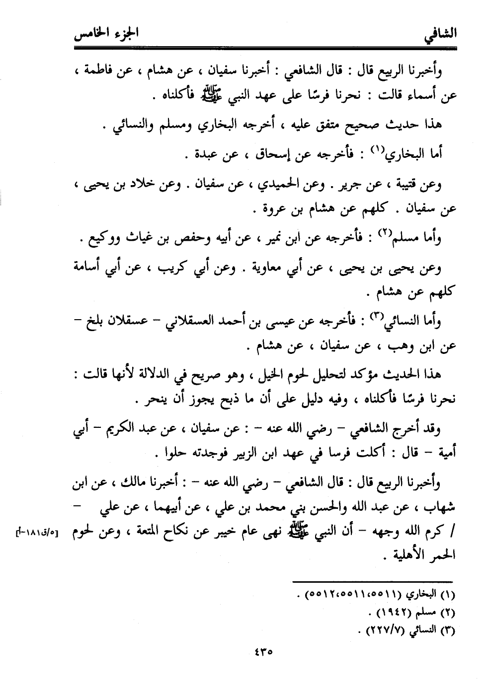 وأخبرنا الربيع قال: قال الشافعي: أخبرنا سفيان، عن هشام، عن فاطمة، عن أسماء قالت: نحرنا فرسًا على عهد النبي - صلى الله عليه وسلم - فأكلناه.