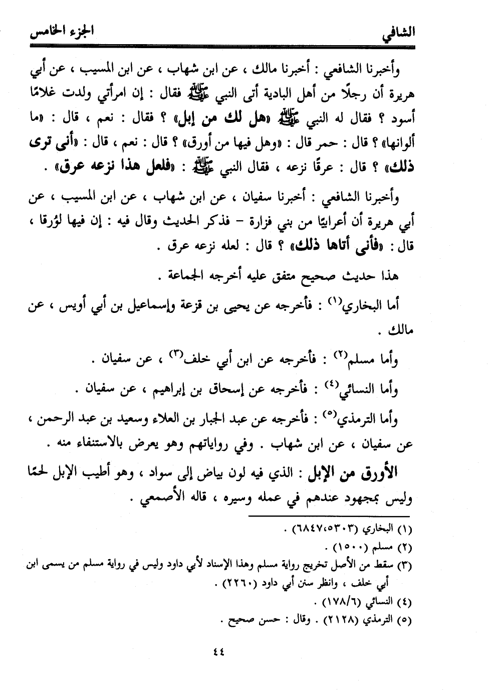 وأخبرنا الشافعي: أخبرنا سفيان، عن ابن شهاب، عن ابن المسيب، عن أبي هريرة أن أعرابيًا من بني فزارة -فذكر الحديث وقال فيه: إن فيها لوُرقا، قال: "فأنى أتاها ذلك"؟ قال: لعله نزعه عرق.