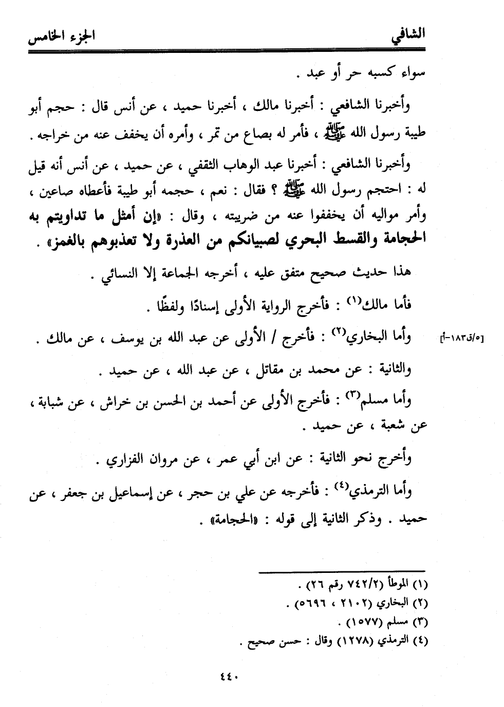 وأخبرنا الشافعي: أخبرنا مالك، أخبرنا حميد، عن أنس قال: حجم أبو طيبة رسول الله - صلى الله عليه وسلم -، فأمر له بصاع من تمر، وأمره أن يخفف عنه من خراجه.