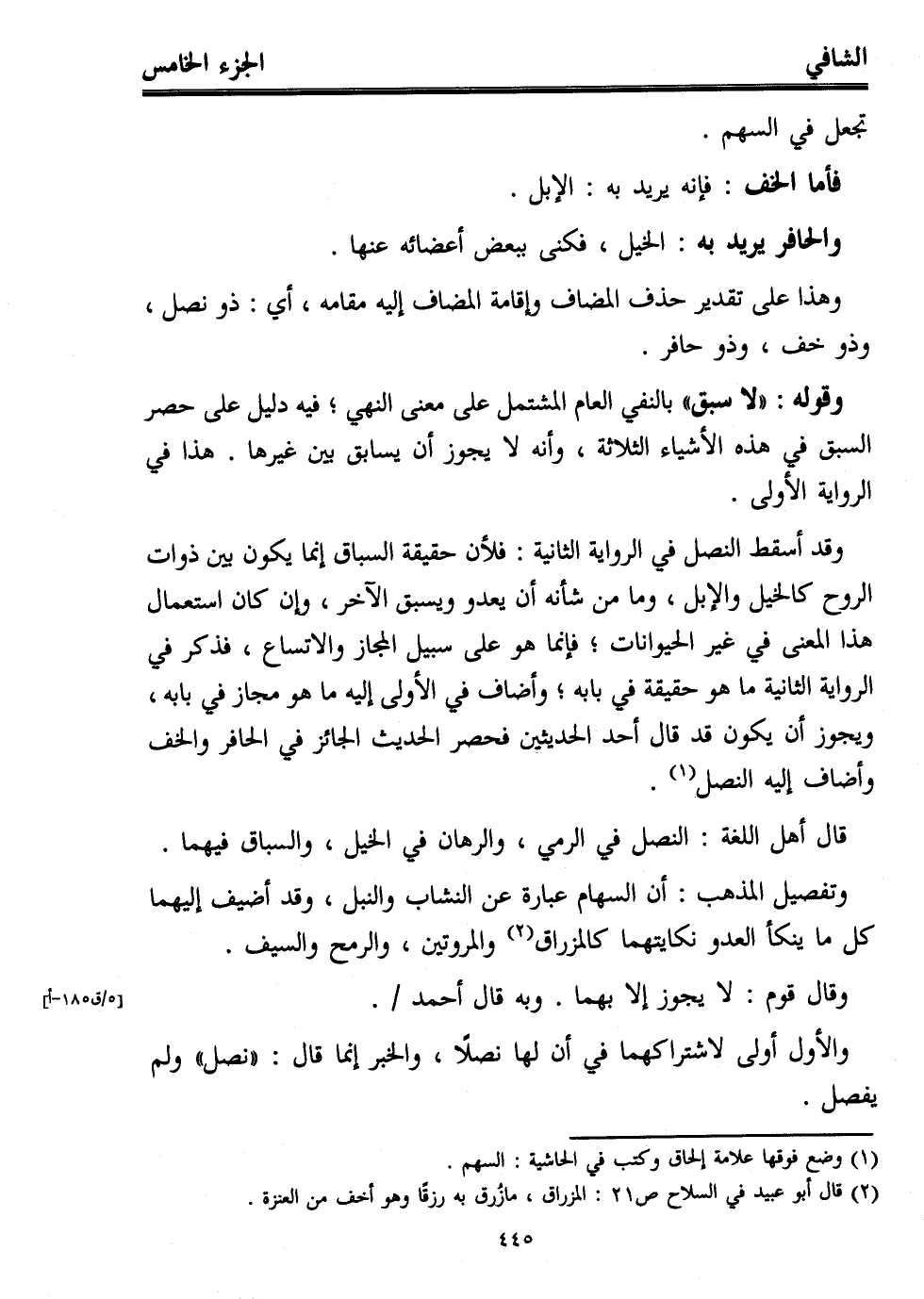 وقد أسقط النصل في الرواية الثانية: فلأن حقيقة السباق إنما يكون بن ذوات الروح كالخيل والإبل، وما من شأنه أن يعدو ويسبق الآخر، وإن كان استعمال هذا المعنى في غير الحيوانات؛ فإنما هو على سبيل المجاز والاتساع، فذكر في الرواية الثانية ما هو حقيقة في بابه؛ وأضاف في الأولى إليه ما هو مجاز في بابه، ويجوز أن يكون قد قال أحد الحديثين فحصر الحديث الجائز في الحافر والخف وأضاف إليه النصل (¬1).