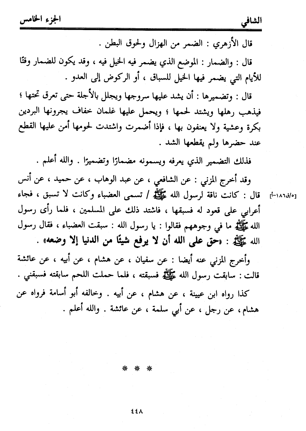وقد أخرج المزني: عن الشافعي، عن عبد الوهاب، عن حميد، عن أنس قال: كانت ناقة لرسول الله - صلى الله عليه وسلم - تسمى العضباء وكانت لا تسبق، فجاء أعرابي على قعود له فسبقها، فاشتد ذلك على المسلمين، فلما رأى رسول الله - صلى الله عليه وسلم - ما في وجوههم فقالوا: يا رسول الله - صلى الله عليه وسلم -: سبقت العضباء، فقال رسول الله - صلى الله عليه وسلم -: "حق على الله أن لا يرفع شيئًا من الدنيا إلا وضعه".
