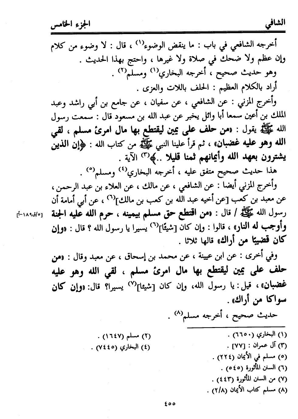 وأخرج المزني: عن الشافعي، عن سفيان، عن جامع بن أبي راشد وعبد الملك بن أعين سمعا أبا وائل يخبر عن عبد الله بن مسعود قال: سمعت رسول الله - صلى الله عليه وسلم - يقول: "من حلف على يمين ليقتطع بها مال امرئ مسلم، لقي الله وهو عليه غضبان"، ثم قرأ علينا النبي - صلى الله عليه وسلم - من كتاب الله: {إِنَّ الَّذِينَ يَشْتَرُونَ بِعَهْدِ اللَّهِ وَأَيْمَانِهِمْ ثَمَنًا قَلِيلًا ...} (¬4) الآية.