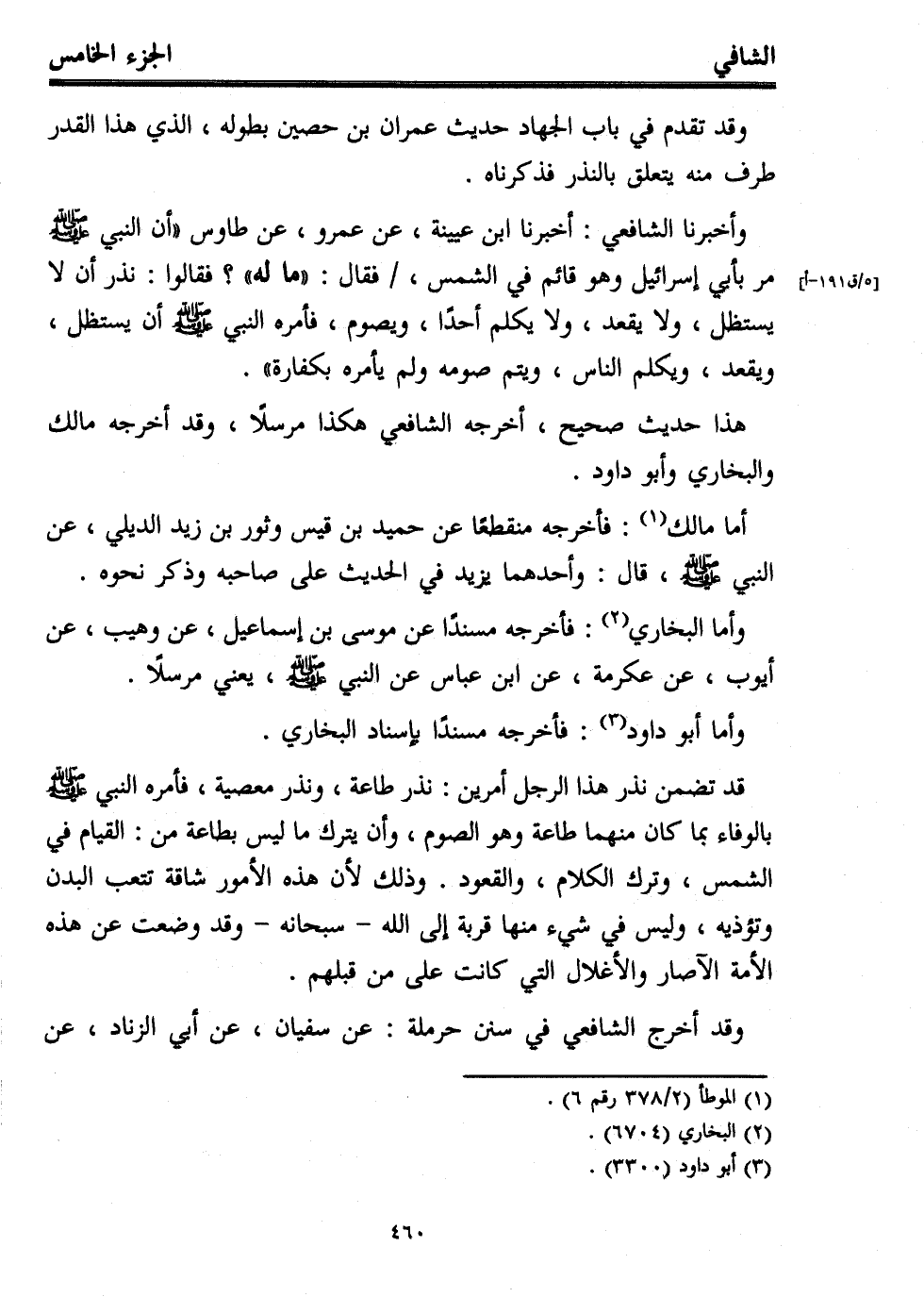 وأخبرنا الشافعي: أخبرنا ابن عيينة، عن عمرو، عن طاوس "أن النبي - صلى الله عليه وسلم - مر بأبي إسرائيل وهو قائم في الشمس، فقال: "ما له"؟ فقالوا: نذر أن لا يستظل، ولا يقعد، ولا يكلم أحدًا، ويصوم، فأمره النبي - صلى الله عليه وسلم - أن يستظل، ويقعد، ويكلم الناس، ويتم صومه ولم يأمره بكفارة".