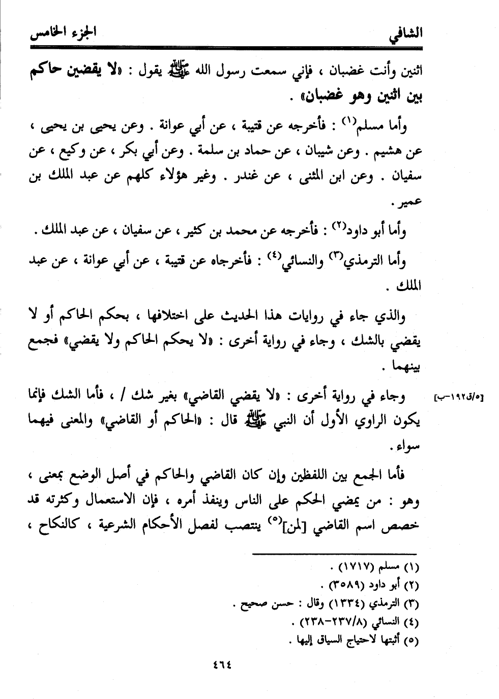 والذي جاء في روايات هذا الحديث على اختلافها، بحكم الحاكم أو لا يقضي بالشك، وجاء في رواية أخرى: "لا يحكم الحاكم ولا يقضي" فجمع بينهما.