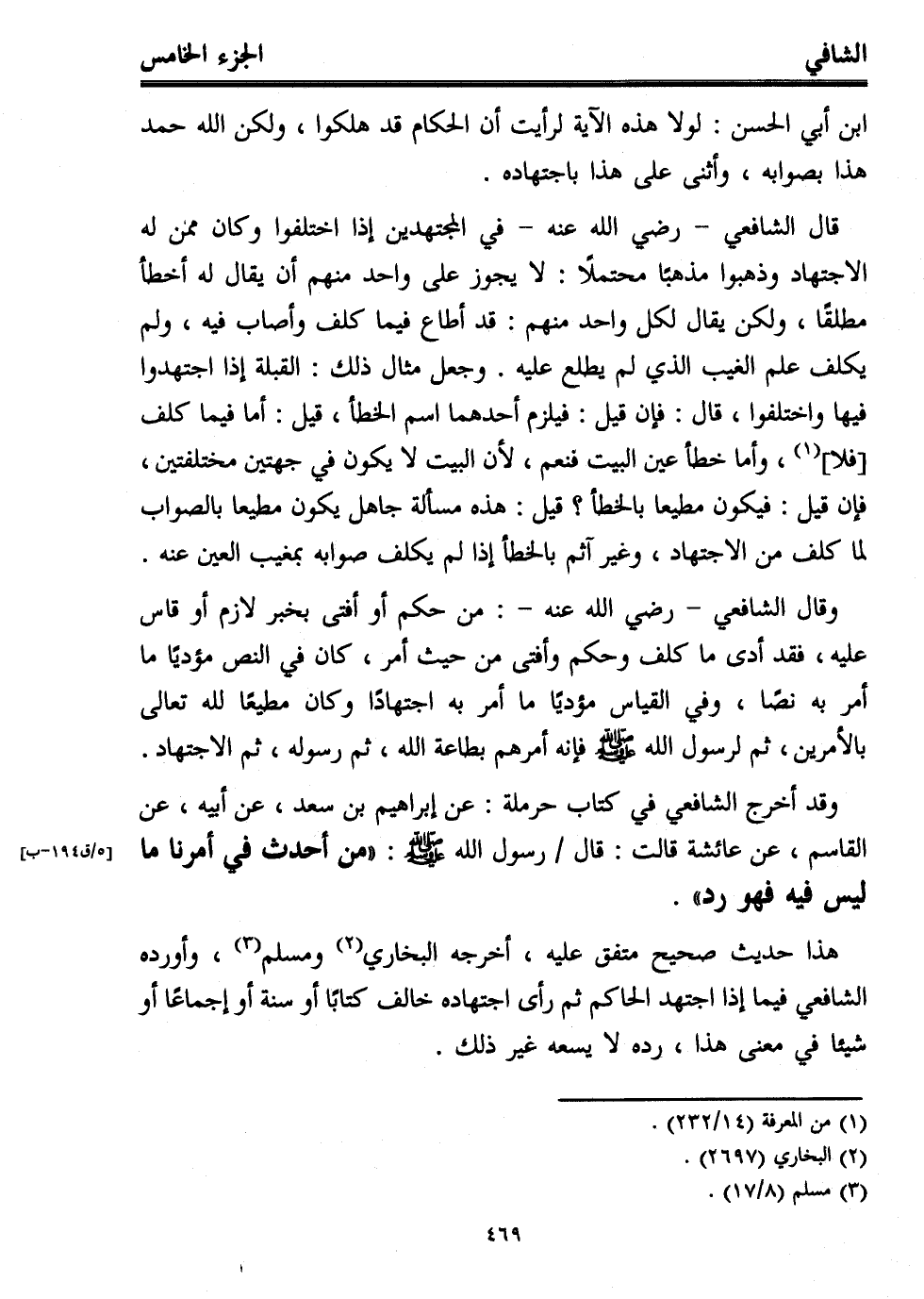 وقد أخرج الشافعي في كتاب حرملة: عن إبراهيم بن سعد، عن أبيه، عن القاسم، عن عائشة قالت: قال رسول الله - صلى الله عليه وسلم -: "من أحدث في أمرنا ما ليس فيه فهو رد".