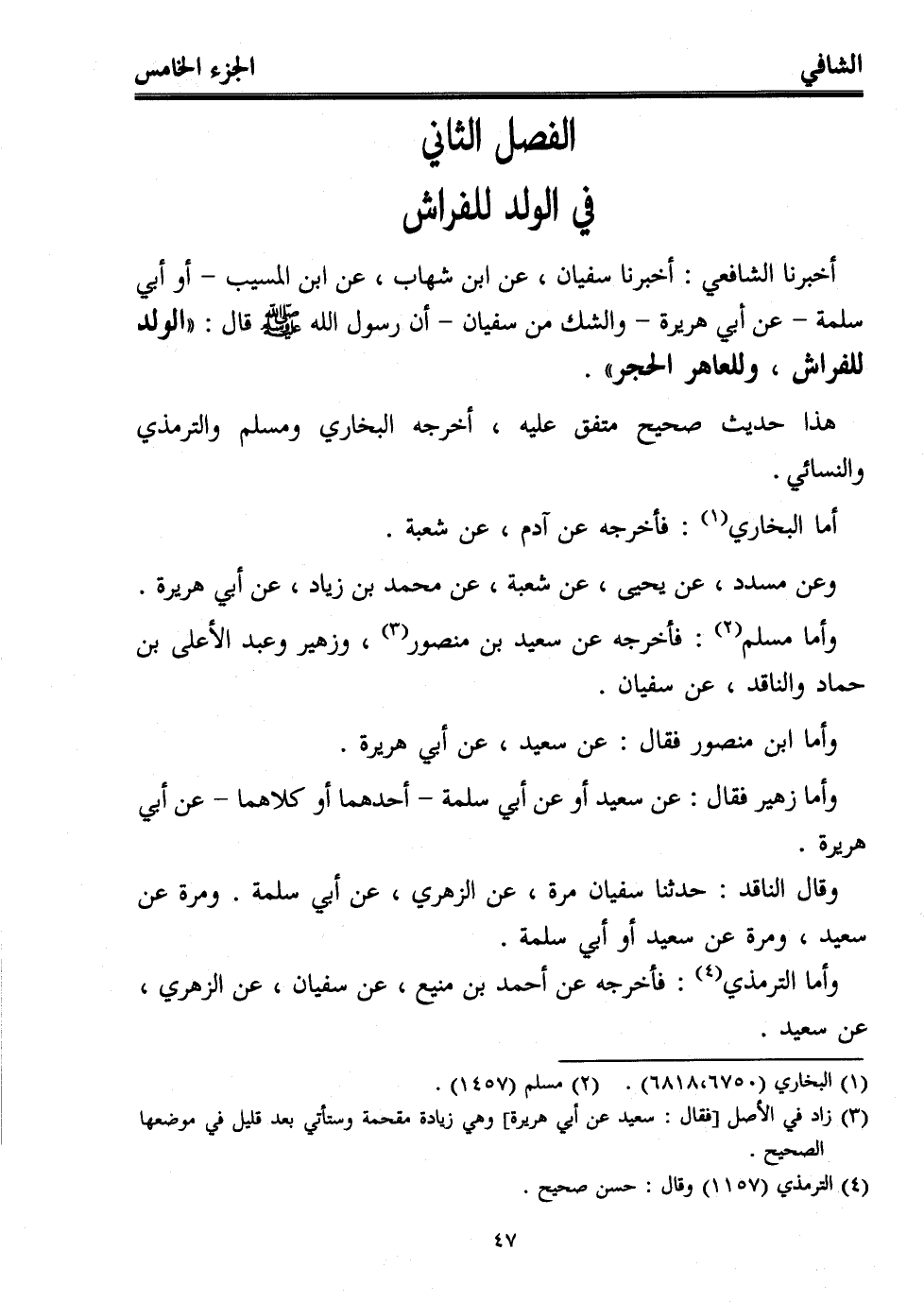 أخبرنا الشافعي: أخبرنا سفيان، عن ابن شهاب، عن ابن المسيب -أو أبي سلمة- عن أبي هريرة -والشك من سفيان- أن رسول الله - صلى الله عليه وسلم - قال: "الولد للفراش، وللعاهر الحجر".