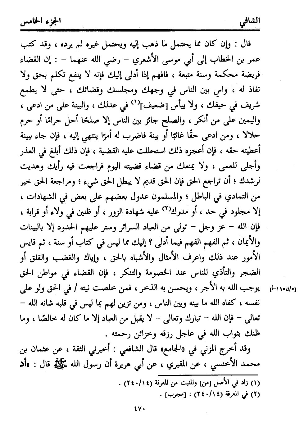 قال: وإن كان مما يحتمل ما ذهب إليه ويحتمل غيره لم يرده، وقد كتب عمر بن الخطاب إلى أبي موسى الأشعري -رضي الله عنهما-: إن القضاء فريضة محكمة وسنة متبعة، فافهم إذا أدلى إليك فإنه لا ينفع تكلم بحق ولا نفاذ له، واسٍ بين الناس في وجهك ومجلسك وقضائك، حتى لا يطمع شريف في حيفك، ولا ييأس [ضعيف] (¬1) في عدلك، والبينة على من ادعى، واليمين على من أنكر، والصلح جائز بين الناس إلا صلحًا أحل حرامًا أو حرم حلالاً، ومن ادعى حقًا غائبًا أو بينة فاضرب له أمرًا ينتهي إليه، فإن جاء ببينة أعطيته حقه، فإن أعجزه ذلك استحللت عليه القضية، فإن ذلك أبلغ في العذر وأجلى للعمى، ولا يمنعك من قضاء قضيته اليوم فراجعت فيه رأيك وهديت لرشدك؛ أن تراجع الحق فإن الحق قديم لا يبطل الحق شيء؛ ومراجعة الحق خير من التمادي في الباطل؛ والمسلمون عدول بعضهم على بعض في الشهادات، إلا مجلود في حد، أو مدرك (¬2) عليه شهادة الزور، أو ظنين في ولاء أو قرابة، فإن الله -عز وجل- تولى من العباد السرائر وستر عليهم الحدود إلا بالبينات والأيمان، ثم الفهم الفهم فيما أدلى؟ إليك مما ليس في كتاب أو سنة، ثم قايس الأمور عند ذلك واعرف الأمثال والأشباه بالحق، وإياك والغضب والقلق أو الضجر والتأذي للناس عند الخصومة والتنكر، فإن القضاء في مواطن الحق يوجب الله به الأجر، ويحسن به الذخر، فمن خلصت نيته في الحق ولو على نفسه، كفاه الله ما بينه وبين الناس، ومن تزين لهم بما ليس في قلبه شأنه الله -تعالى- فإن الله -تبارك وتعالى- لا يقبل من العباد إلا ما كان له خالصًا، وما ظنك بثواب الله في عاجل رزقه وخزائن رحمته.