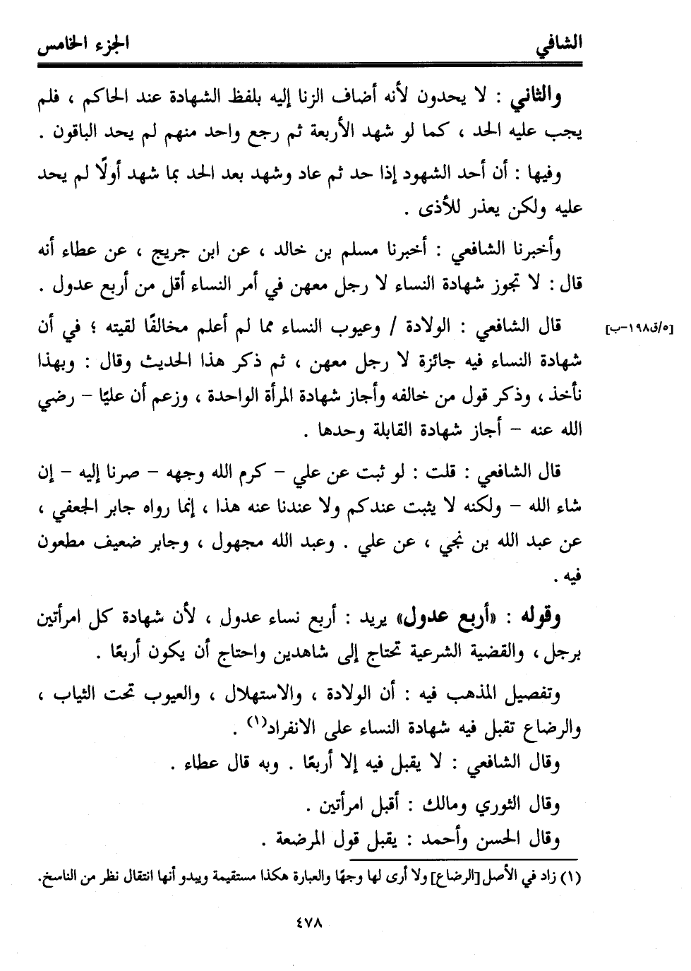 وأخبرنا الشافعي: أخبرنا مسلم بن خالد، عن ابن جريج، عن عطاء أنه قال: لا تجوز شهادة النساء لا رجل معهن في أمر النساء أقل من أربع عدول.