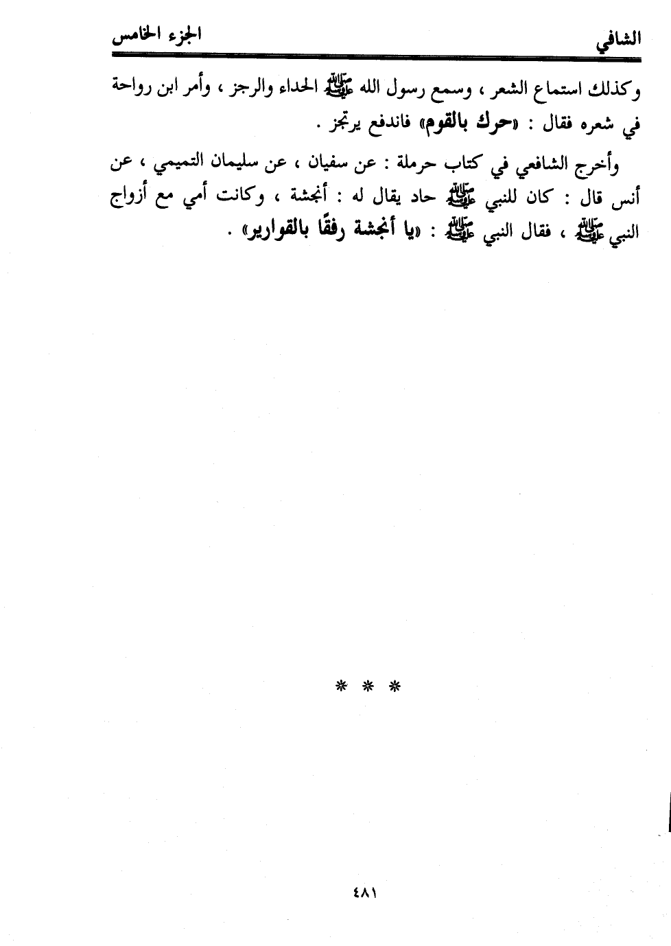وأخرج الشافعي في كتاب حرملة: عن سفيان، عن سليمان التميمي، عن أنس قال: كان للنبي - صلى الله عليه وسلم - حاد يقال له: أنجشة، وكانت أمي مع أزواج النبي - صلى الله عليه وسلم -، فقال النبي - صلى الله عليه وسلم -: "يا أنجشة رفقًا بالقوارير".