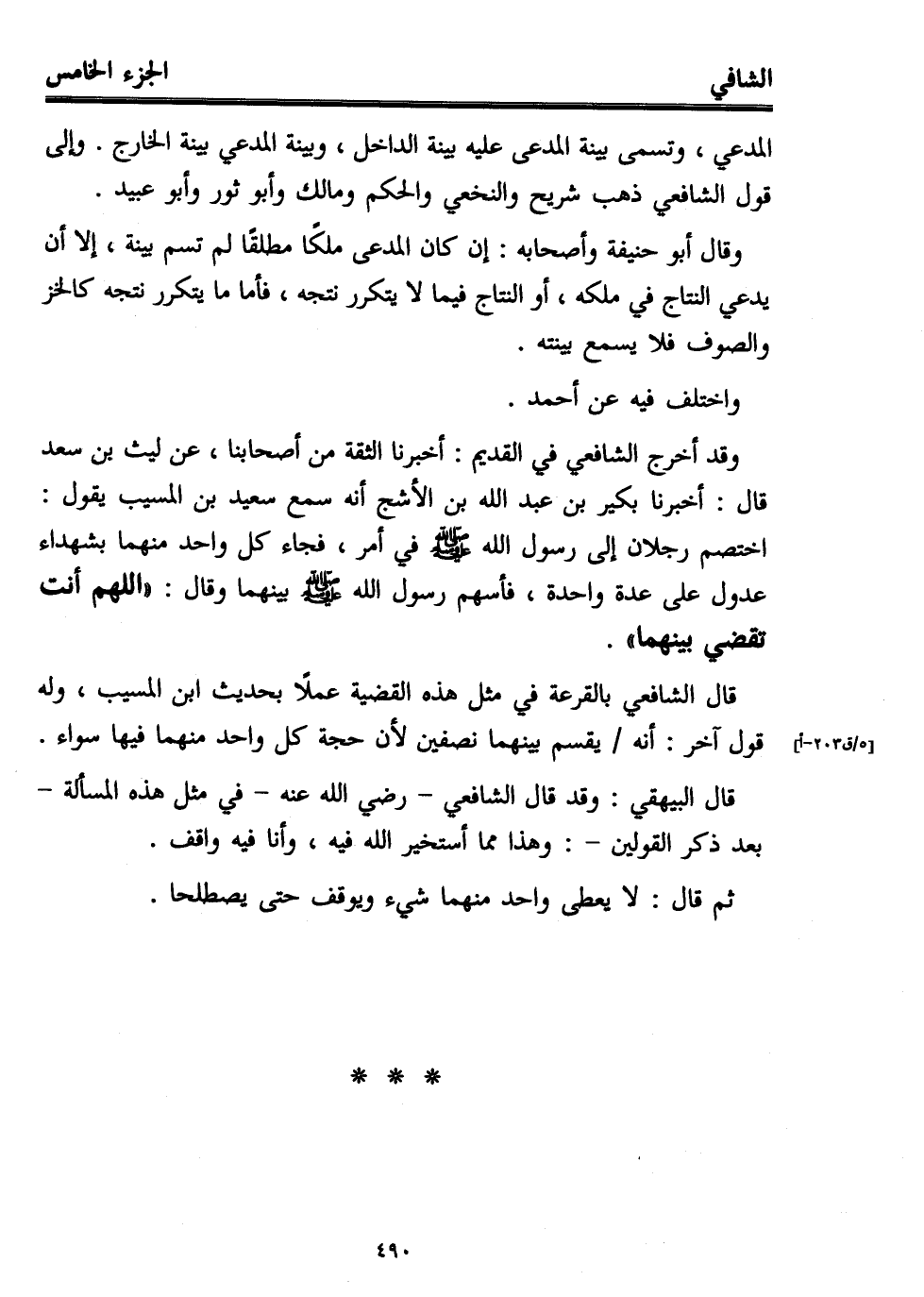 وقد أخرج الشافعي في القديم: أخبرنا الثقة من أصحابنا، عن ليث بن سعد قال: أخبرنا بكير بن عبد الله بن الأشج أنه سمع سعيد بن المسيب يقول: اختصم رجلان إلى رسول الله - صلى الله عليه وسلم - في أمر، فجاء كل واحد منهما بشهداء عدول على عدة واحدة، فأسهم رسول الله - صلى الله عليه وسلم - بينهما وقال: "اللهم أنت تقضي بينهما".