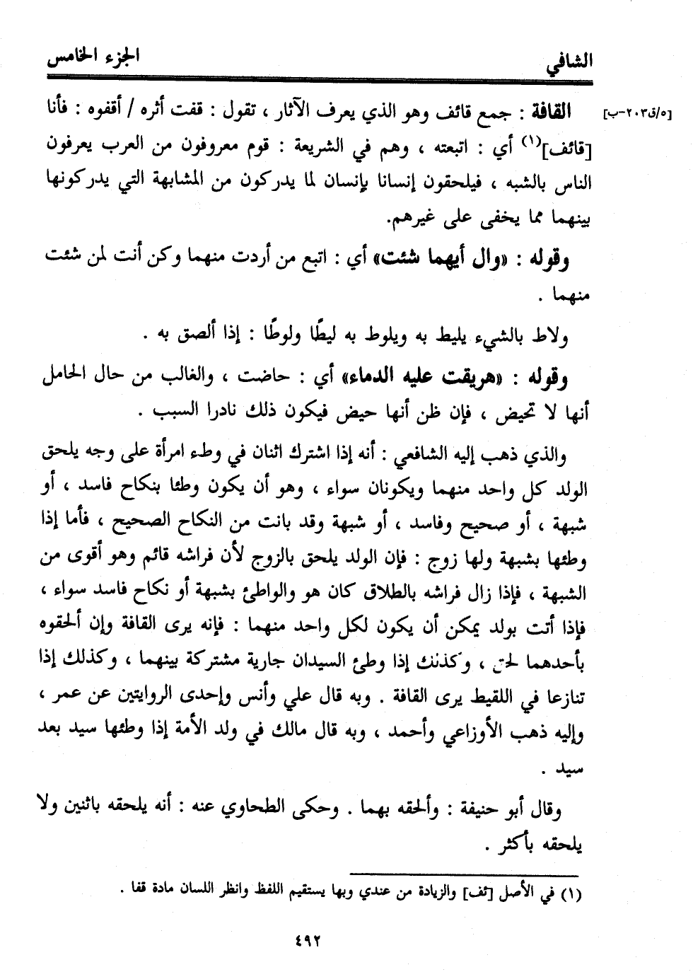 القافة: جمع قائف وهو الذي يعرف الآثار، تقول: قفت أثره أقفوه: فأنا [قائف] (¬1) أي: اتبعته، وهم في الشريعة: قوم معروفون من العرب يعرفون الناس بالشبه، فيلحقون إنسانا بإنسان لما يدركون من المشابهة التي يدركونها بينهما مما يخفى على غيرهم.