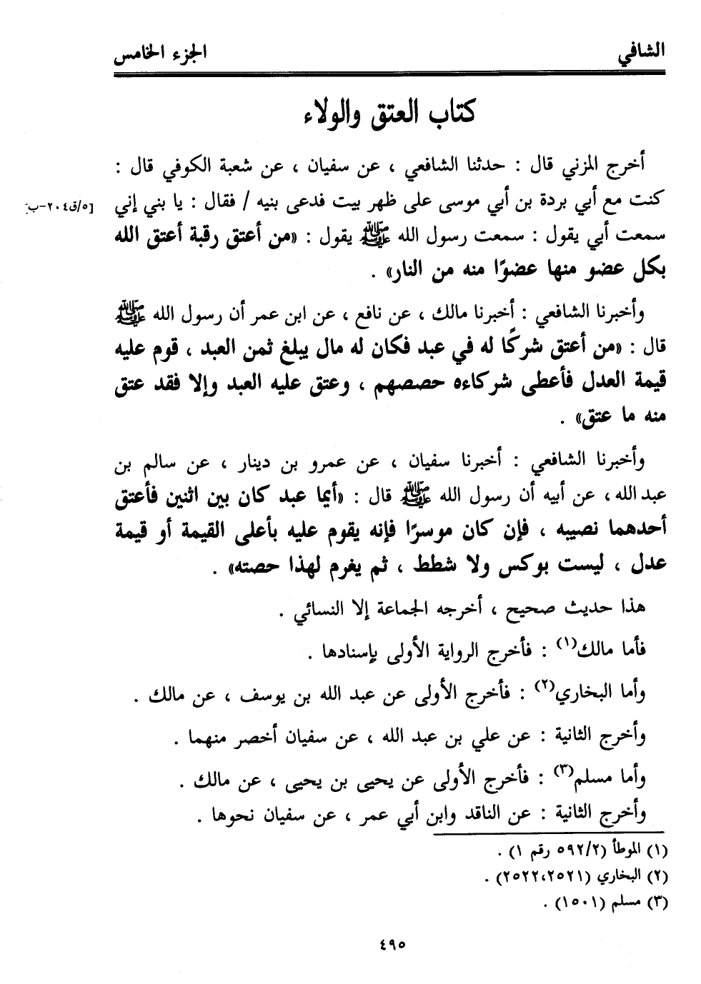 أخرج المزني قال: حدثنا الشافعي، عن سفيان، عن شعبة الكوفي قال: كنت مع أبي بردة بن أبي موسى على ظهر بيت فدعى بنيه فقال: يا بني إني سمعت أبي يقول: سمعت رسول الله - صلى الله عليه وسلم - يقول: "من أعتق رقبة أعتق الله بكل عضو منها عضوًا منه من النار".