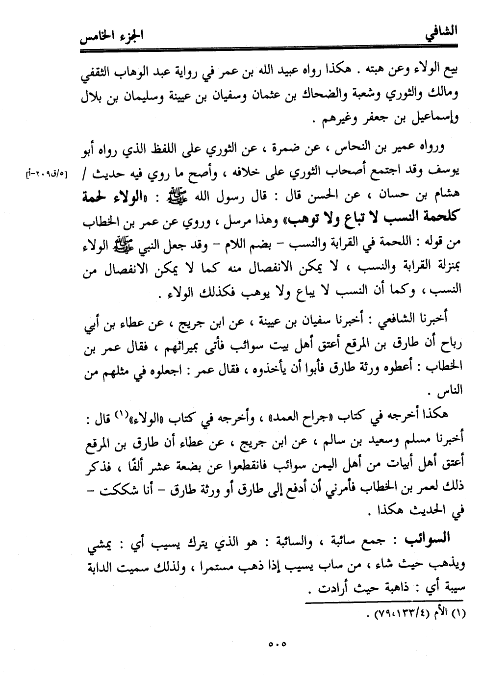 أخبرنا الشافعي: أخبرنا سفيان بن عيينة، عن ابن جريج، عن عطاء بن أبي رباح أن طارق بن المرقع أعتق أهل بيت سوائب فأتى بميراثهم، فقال عمر بن الخطاب: أعطوه ورثة طارق فأبوا أن يأخذوه، فقال عمر: اجعلوه في مثلهم من الناس.