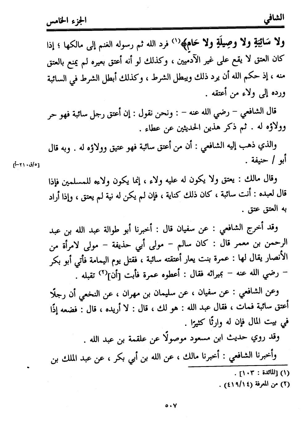 قال الشافعي -رضي الله عنه-: ونحن نقول: إن أعتق رجل سائبة فهو حر وولاؤه له. ثم ذكر هذين الحديثين عن عطاء.