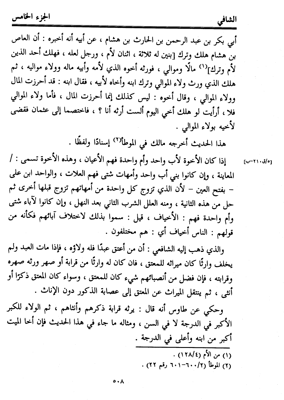 أبي بكر بن عبد الرحمن بن الحارث بن هشام، عن أبيه أنه أخبره: أن العاص بن هشام هلك وترك [بنين له ثلاثة، اثنان لأم، ورجل لعله، فهلك أحد الذين لأم وترك] (¬1) مالًا وموالي، فورثه أخوه الذي لأمه وأبيه ماله وولاء مواليه، ثم هلك الذي ورث ولاء الموالي وترك ابنه وأخاه لأبيه، فقال ابنه: قد أحرزت المال وولاء الموالي، وقال أخوه: ليس كذلك إنما أحرزت المال، فأما ولاء الموالي فلا، أرأيت لو هلك أخي اليوم ألست أرثه أنا؟، فاختصما إلى عثمان فقضى لأخيه بولاء الموالي.