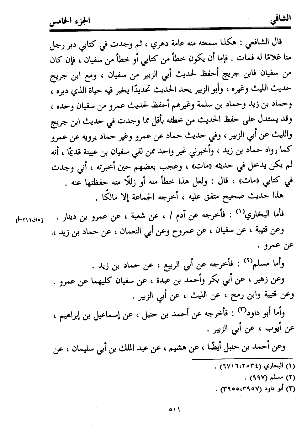 قال الشافعي: هكذا سمعته منه عامة دهري، ثم وجدت في كتابي دبر رجل منا غلامًا له فمات. فإما أن يكون خطأ من كتابي أو خطأ من سفيان، فإن كان من سفيان فابن جريج أحفظ لحديث أبي الزبير من سفيان، ومع ابن جريج حديث الليث وغيره، وأبو الزبير يحد الحديث تحديدًا يخبر فيه حياة الذي دبره، وحماد بن زيد وحماد بن سلمة وغيرهم أحفظ لحديث عمرو من سفيان وحده، وقد يستدل على حفظ الحديث من خطئه بأقل مما وجدت في حديث ابن جريج والليث عن أبي الزبير، وفي حديث حماد عن عمرو وغير حماد يرويه عن عمرو كما رواه حماد بن زيد، وأخبرني غير واحد ممن لقي سفيان بن عيينة قديمًا، أنه لم يكن يدخل في حديثه "مات"، وعجب بعضهم حين أخبرته، أني وجدت في كتابي "مات"، قال: ولعل هذا خطأ منه أو زللًا منه حفظتها عنه.