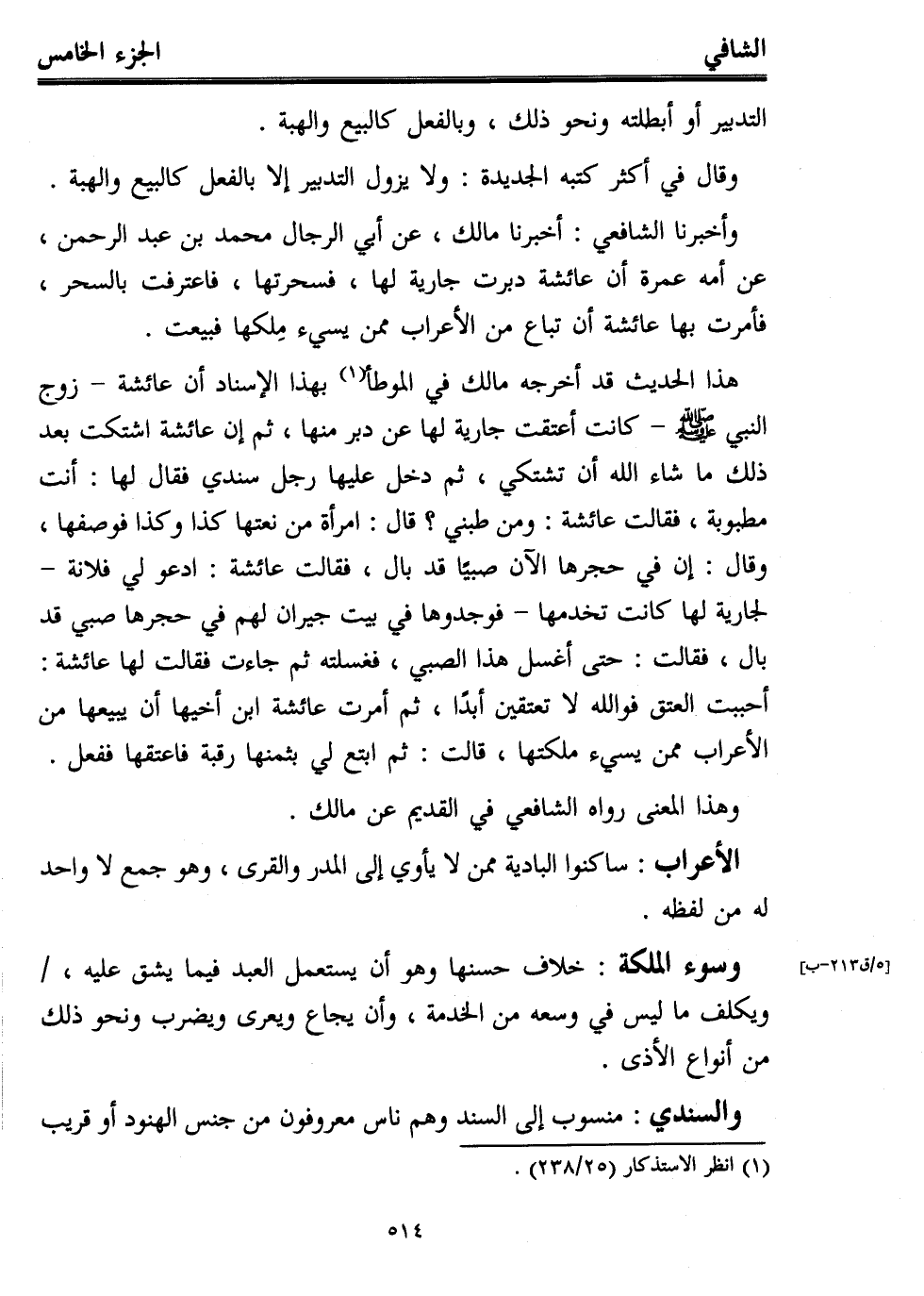 وأخبرنا الشافعي: أخبرنا مالك، عن أبي الرجال محمد بن عبد الرحمن، عن أمه عمرة أن عائشة دبرت جارية لها، فسحرتها، فاعترفت بالسحر، فأمرت بها عائشة أن تباع من الأعراب ممن يسيء مِلكها فبيعت. هذا الحديث قد أخرجه مالك في الموطأ (¬1) بهذا الإسناد أن عائشة -زوج النبي - صلى الله عليه وسلم- كانت أعتقت جارية لها عن دبر منها، ثم إن عائشة اشتكت بعد ذلك ما شاء الله أن تشتكي، ثم دخل عليها رجل سندي فقال لها: أنت مطبوبة، فقالت عائشة: ومن طبني؟ قال: امرأة من نعتها كذا وكذا فوصفها، وقال: إن في حجرها الآن صبيًا قد بال، فقالت عائشة: ادعو لي فلانة - لجارية لها كانت تخدمها- فوجدوها في بيت جيران لهم في حجرها صبي قد بال، فقالت: حتى أغسل هذا الصبي، فغسلته ثم جاءت فقالت لها عائشة: أحببت العتق فوالله لا تعتقين أبدًا، ثم أمرت عائشة ابن أخيها أن يبيعها من الأعراب ممن يسيء ملكتها، قالت: ثم ابتع لي بثمنها رقبة فأعتقها ففعل.