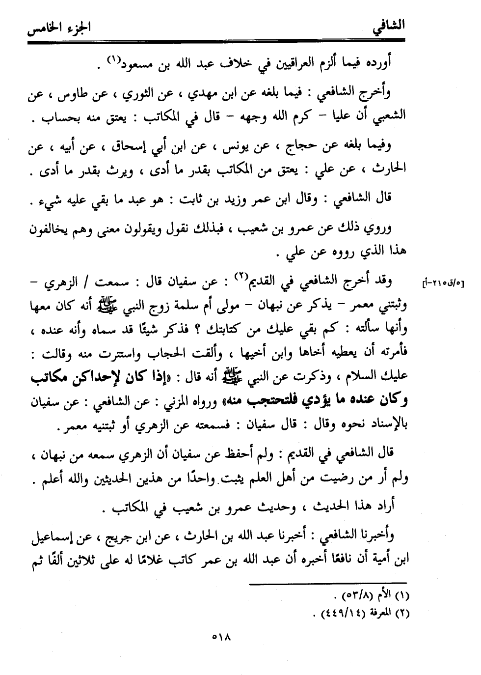 وأخبرنا الشافعي: أخبرنا عبد الله بن الحارث، عن ابن جريج، عن إسماعيل ابن أمية أن نافعًا أخبره أن عبد الله بن عمر كاتب غلامًا له على ثلاثين ألفًا ثم
