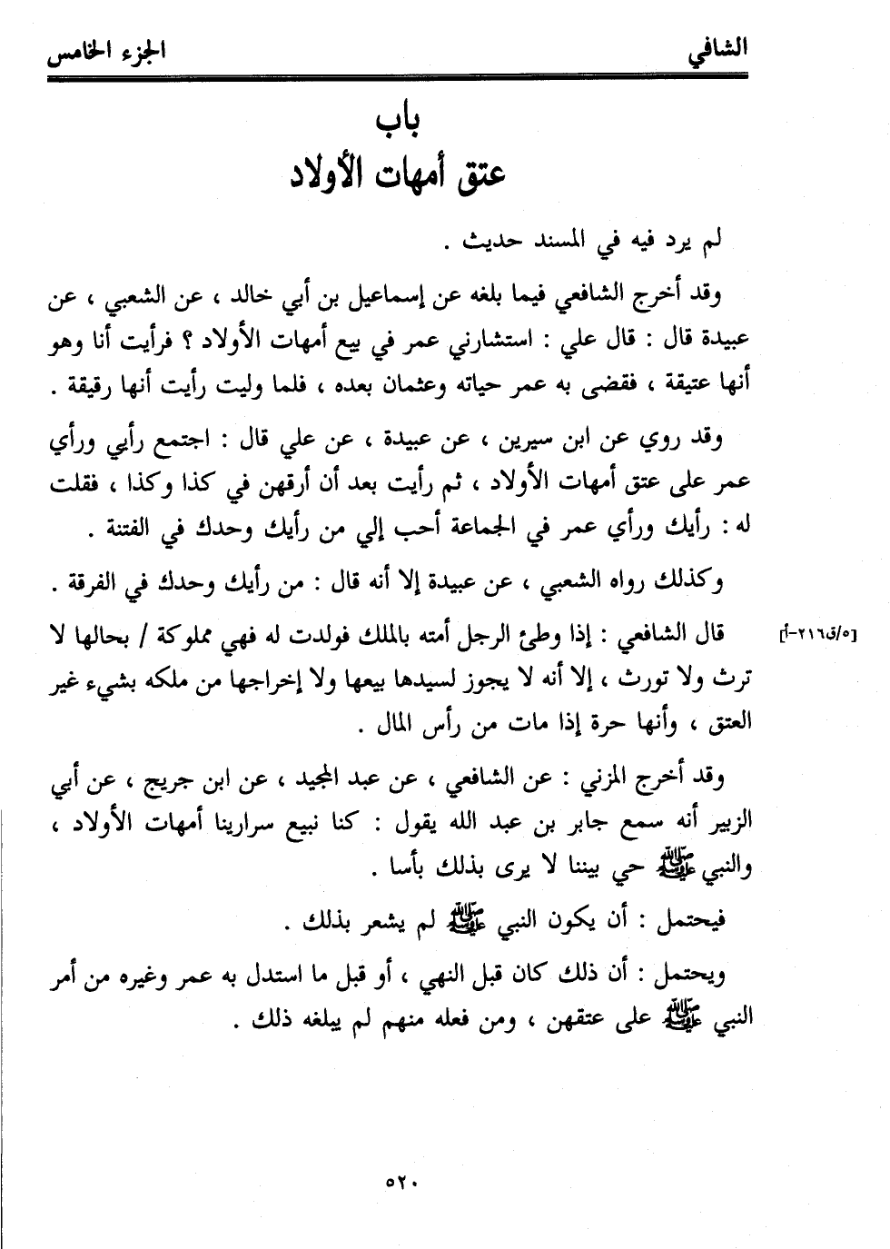 وقد أخرج الشافعي فيما بلغه عن إسماعيل بن أبي خالد، عن الشعبي، عن عبيدة قال: قال علي: استشارني عمر في بيع أمهات الأولاد؟ فرأيت أنا وهو أنها عتيقة، فقضى به عمر حياته وعثمان بعده، فلما وليت رأيت أنها رقيقة.
