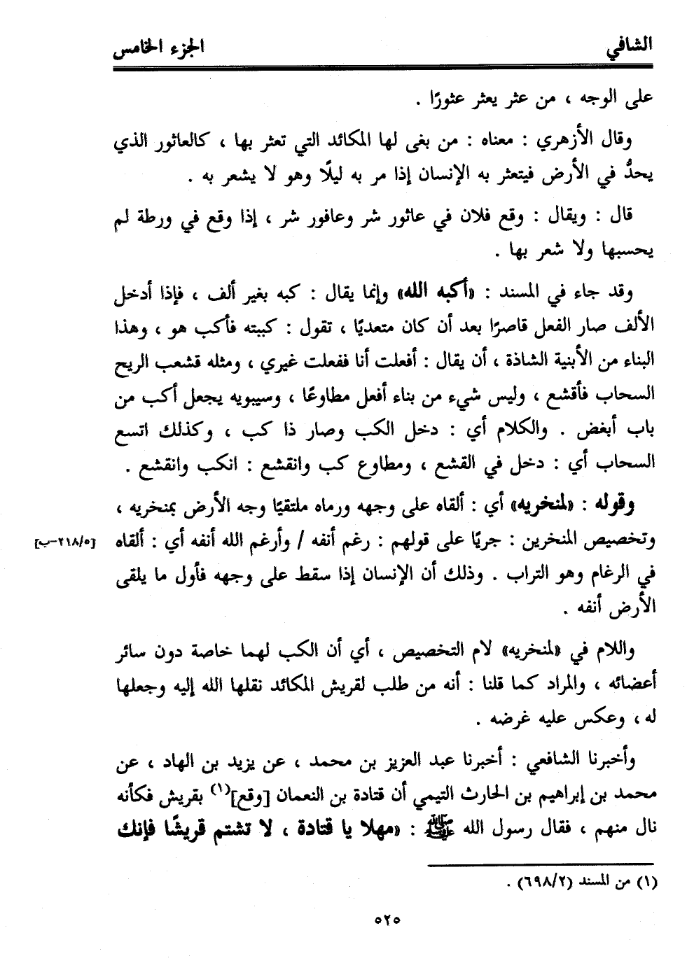 وقد جاء في المسند: "أكبه الله" وإنما يقال: كبه بغير ألف، فإذا أدخل الألف صار الفعل قاصرًا بعد أن كان متعديًا، تقول: كببته فأكب هو، وهذا البناء من الأبنية الشاذة، أن يقال: أفعلت أنا ففعلت غيري، ومثله قشعب الريح السحاب فأقشع، وليس شيء من بناء أفعل مطاوعًا، وسيبويه يجعل أكب من باب أبغض. والكلام أي: دخل الكب وصار ذا كب، وكذلك اتسع السحاب أي: دخل في القشع، ومطاوع كب وانقشع: انكب وانقشع.