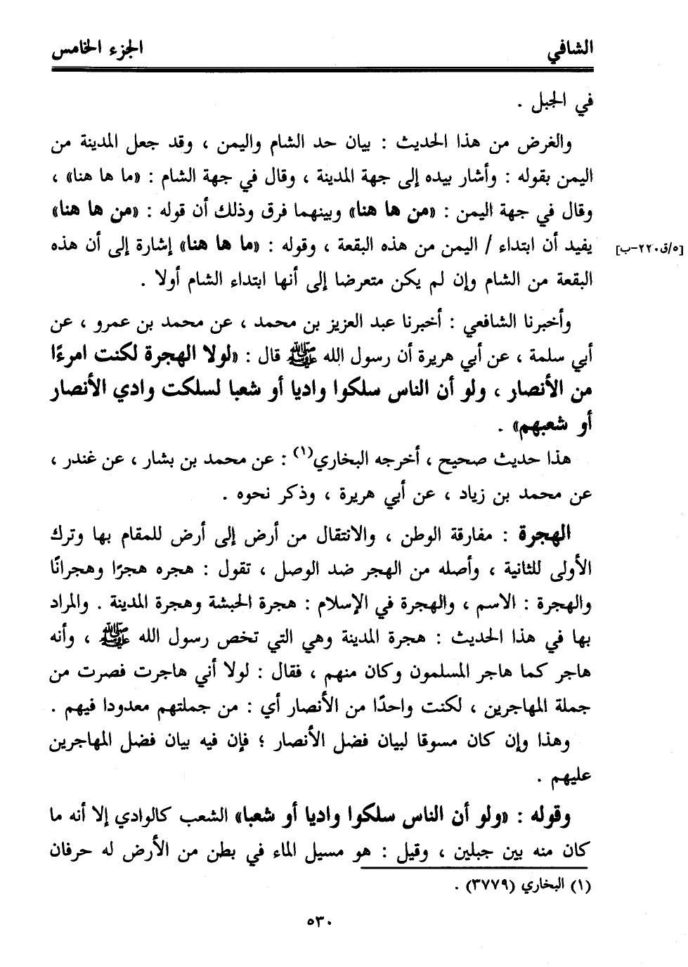 وأخبرنا الشافعي: أخبرنا عبد العزيز بن محمد، عن محمد بن عمرو، عن أبي سلمة، عن أبي هريرة أن رسول الله - صلى الله عليه وسلم - قال: "لولا الهجرة لكنت امرءًا من الأنصار، ولو أن الناس سلكوا واديًا أو شعبا لسلكت وادي الأنصار أو شعبهم".