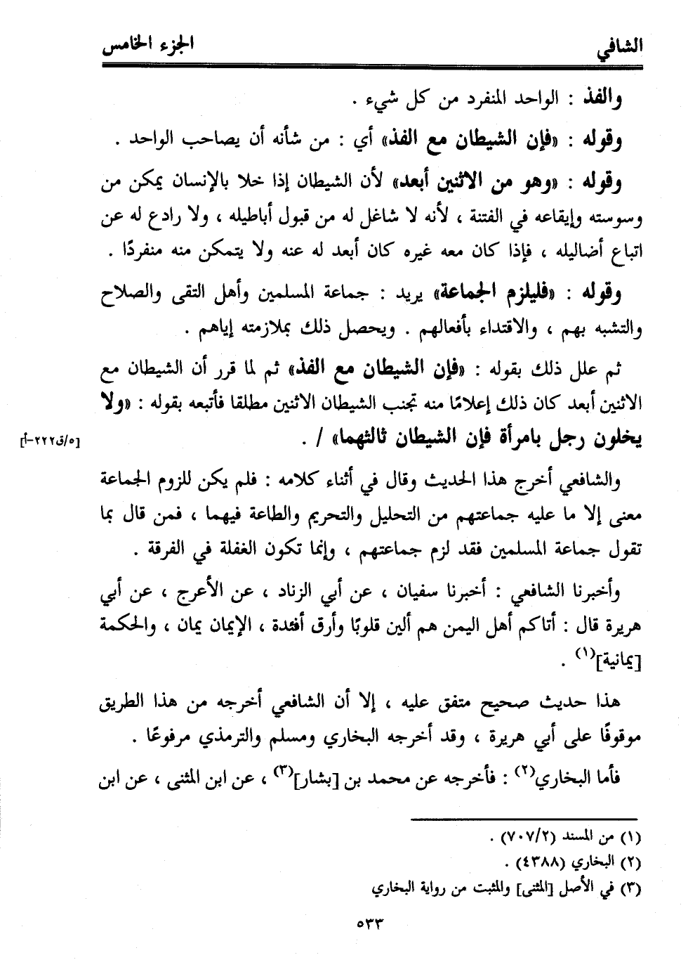 والشافعي أخرج هذا الحديث وقال في أثناء كلامه: فلم يكن للزوم الجماعة معنى إلا ما عليه جماعتهم من التحليل والتحريم والطاعة فيهما، فمن قال بما تقول جماعة المسلمين فقد لزم جماعتهم، وإنما تكون الغفلة في الفرقة.