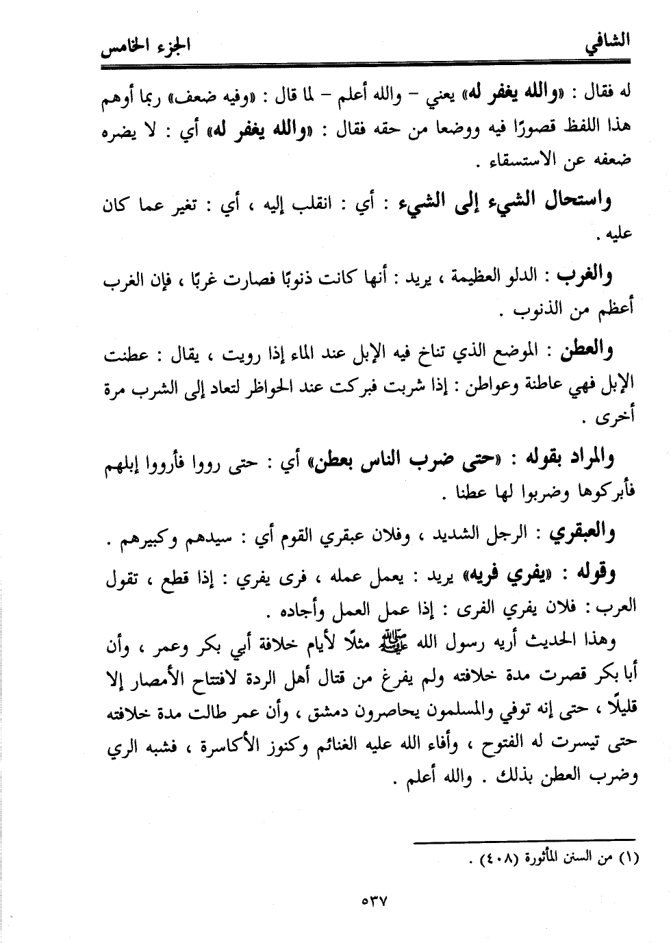 وهذا الحديث أريه رسول الله - صلى الله عليه وسلم - مثلًا لأيام خلافة أبي بكر وعمر، وأن أبا بكر قصرت مدة خلافته ولم يفرغ من قتال أهل الردة لافتتاح الأمصار إلا قليلاً، حتى إنه توفي والمسلمون يحاصرون دمشق، وأن عمر طالت مدة خلافته حتى تيسرت له الفتوح، وأفاء الله عليه الغنائم وكنوز الأكاسرة، فشبه الري وضرب العطن بذلك. والله أعلم.
