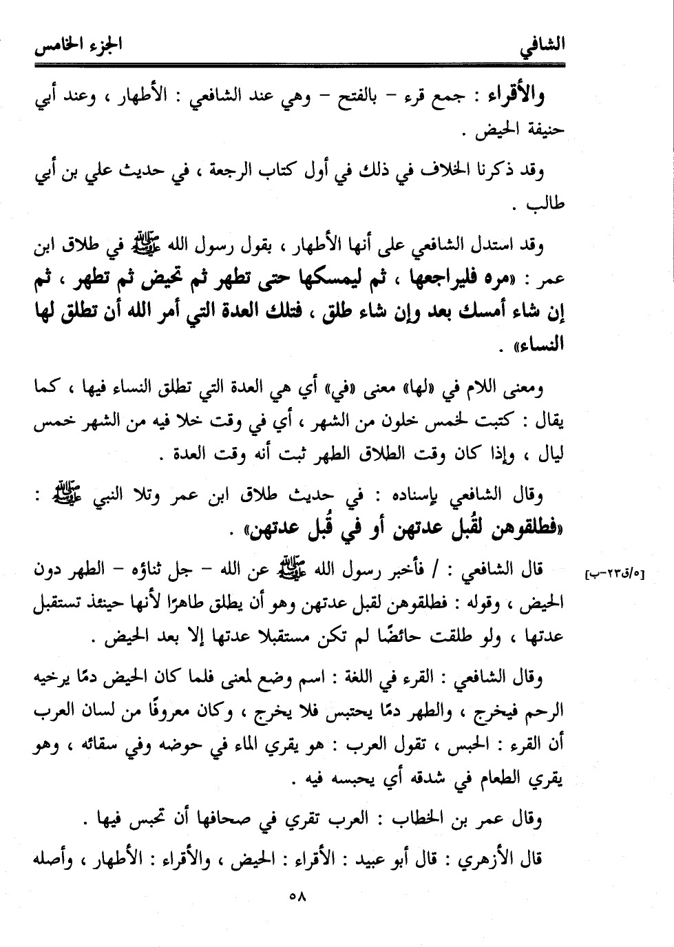 وقال الشافعي بإسناده: في حديث طلاق ابن عمر وتلا النبي - صلى الله عليه وسلم -: "فطلقوهن لقُبل عدتهن أو في قُبل عدتهن".