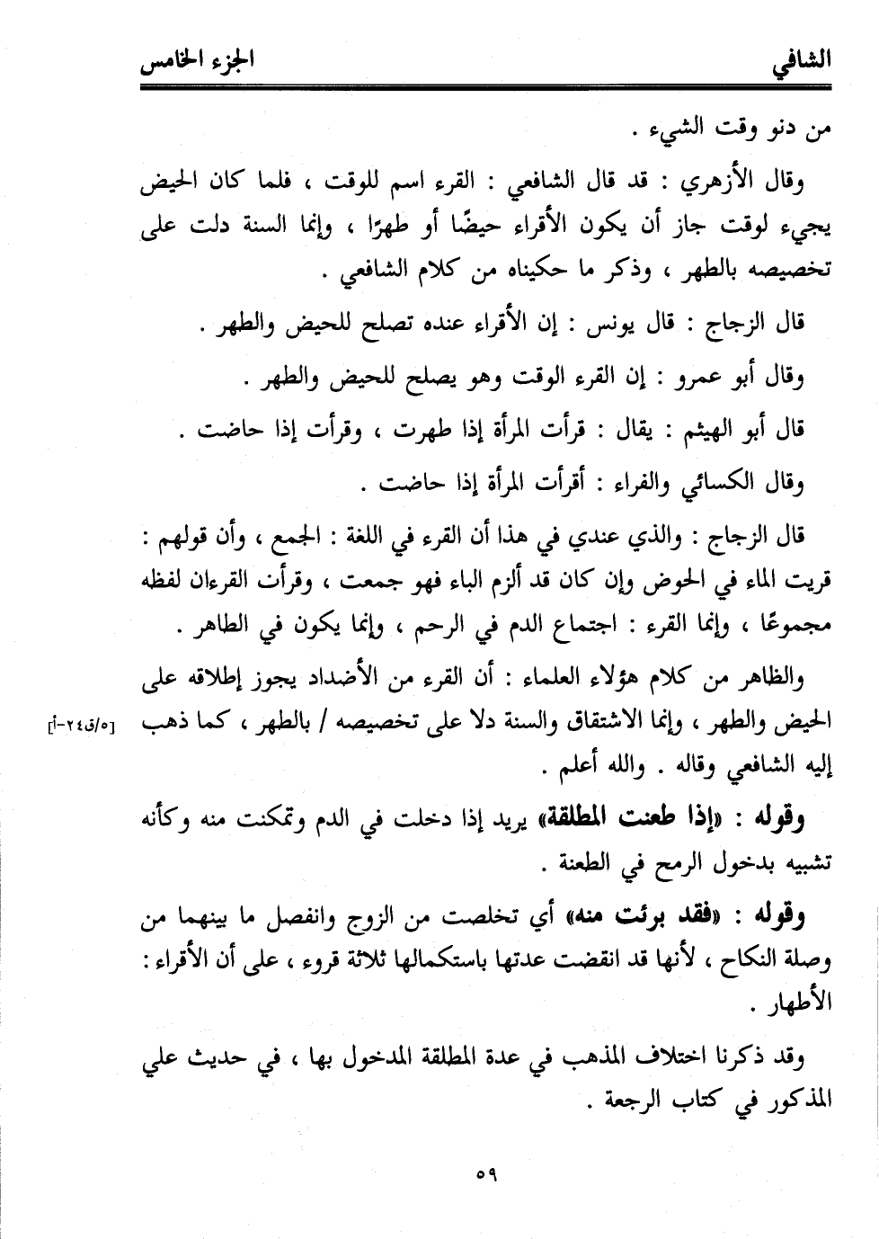 وقال الأزهري: قد قال الشافعي: القرء اسم للوقت، فلما كان الحيض يجيء لوقت جاز أن يكون الأقراء حيضًا أو طهرًا، وإنما السنة دلت على تخصيصه بالطهر، وذكر ما حكيناه من كلام الشافعي.